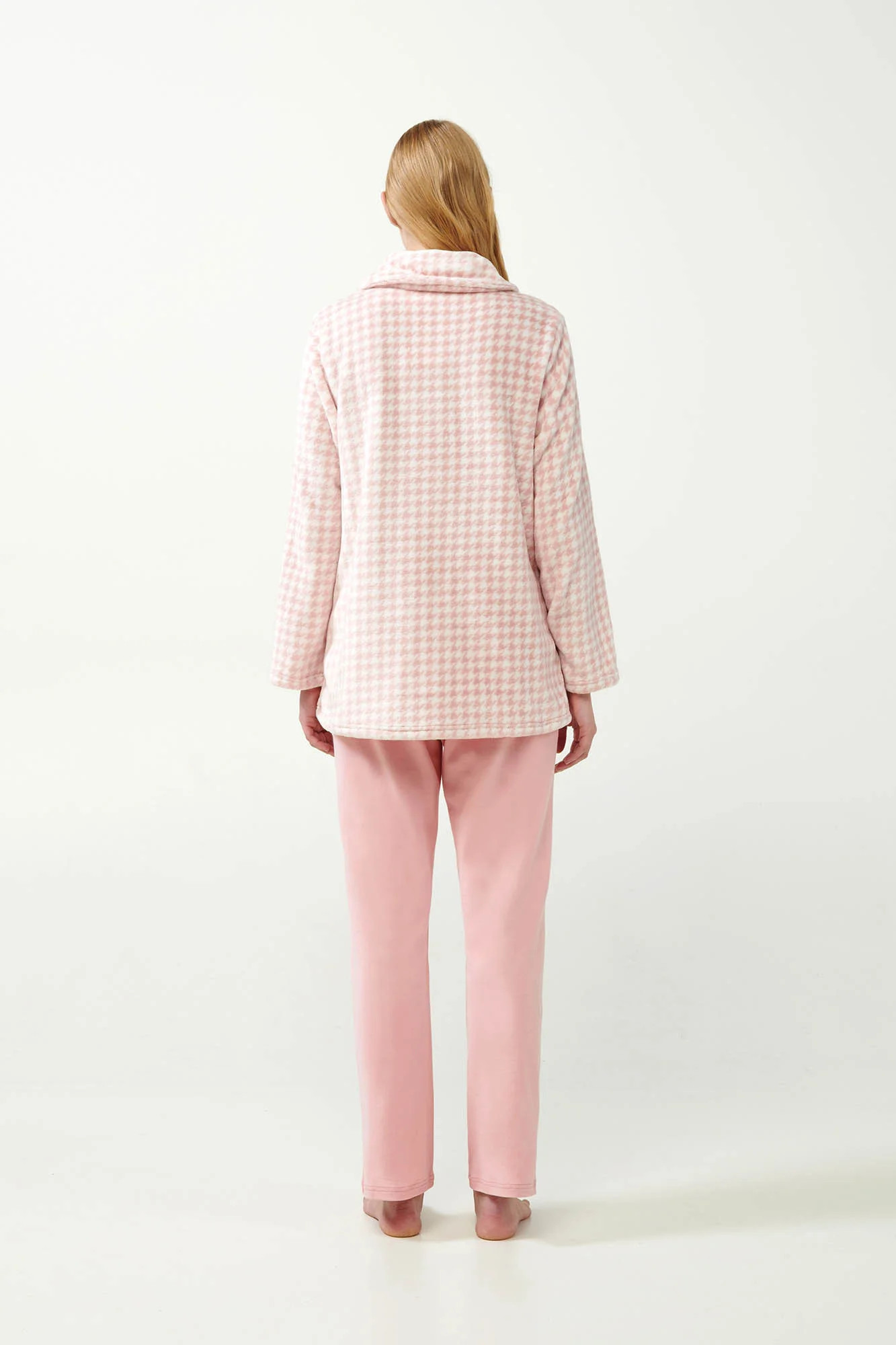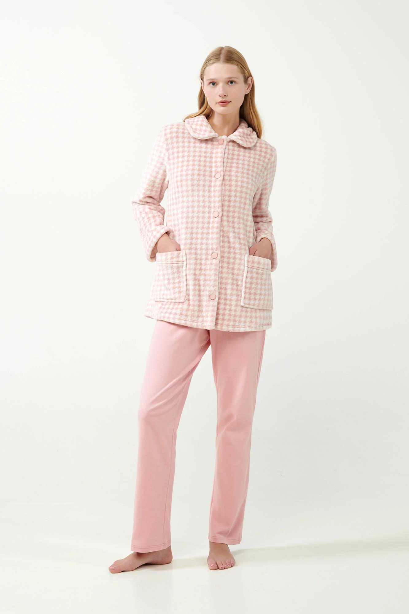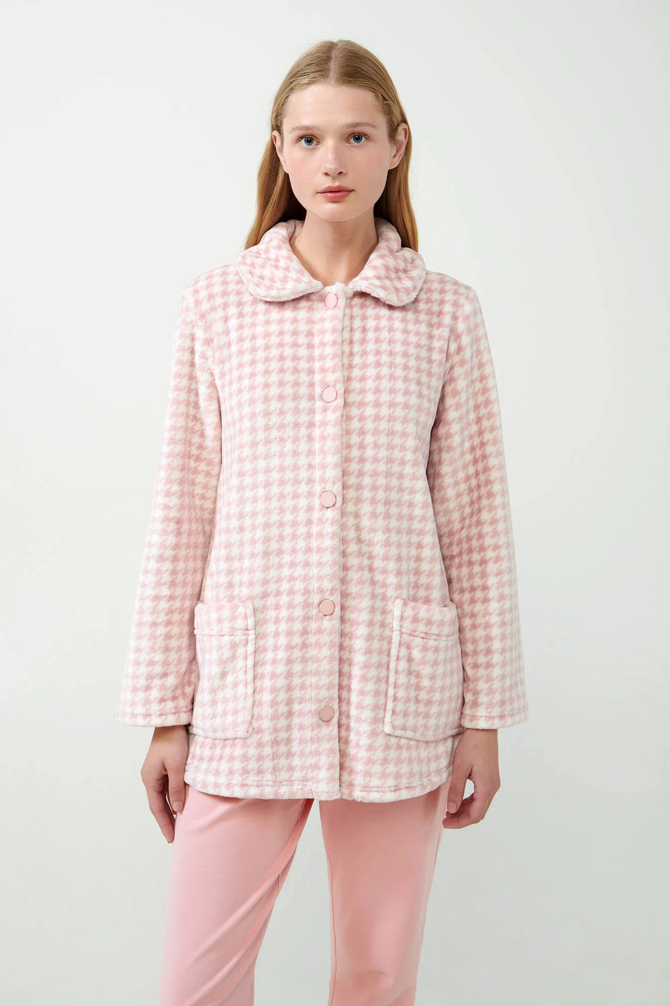 Oživte svůj šatník dámským flanelovým županem Pied de Poule. Tento stylový župan, vyrobený ze 100% flanelového fleecu, představuje výrazný vzor pied de poule v kompaktním krátkém provedení. Klasické zapínání na knoflíky a puritánský límec působí sofistikovaně. Je praktický a elegantní a skvěle se hodí pro domácí relaxaci nebo pro dodání nádechu elegance ve chvílích volna. Vychutnejte si dokonalou kombinaci klasického šarmu a útulného pohodlí.