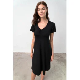 - délka a střih: 105 cm, krátký rukáv, výstřih do V