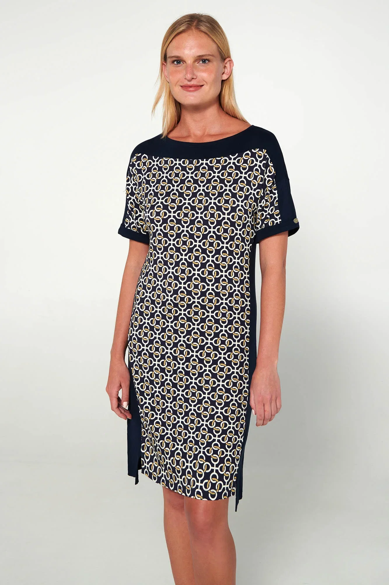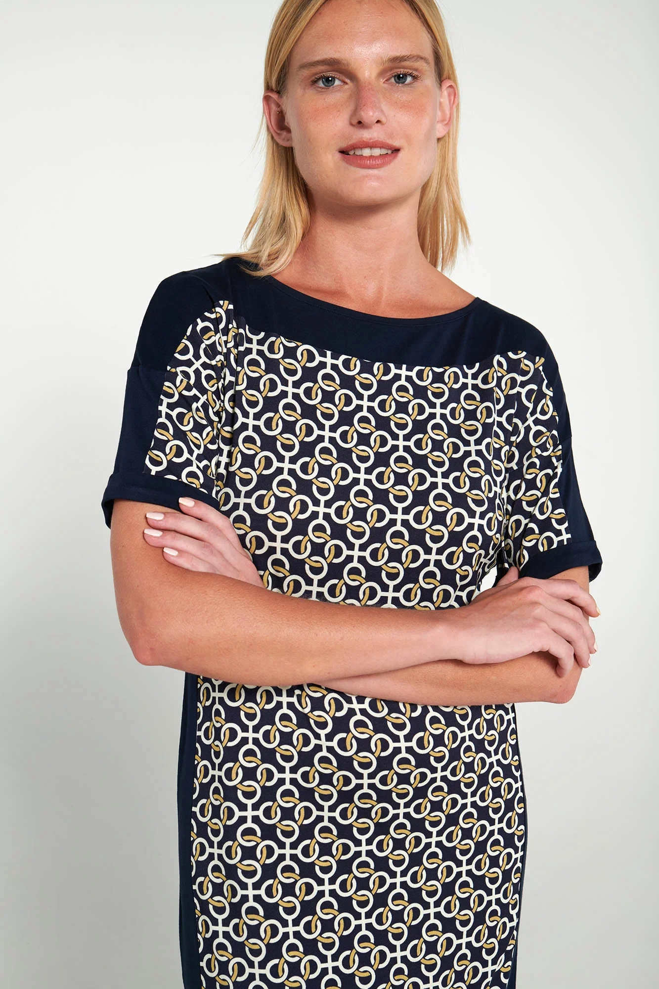 Šaty s krátkými rukávy a širokým kulatým výstřihem, v uvolněném střihu. Letní, námořnický potisk, ideální na dovolenou.