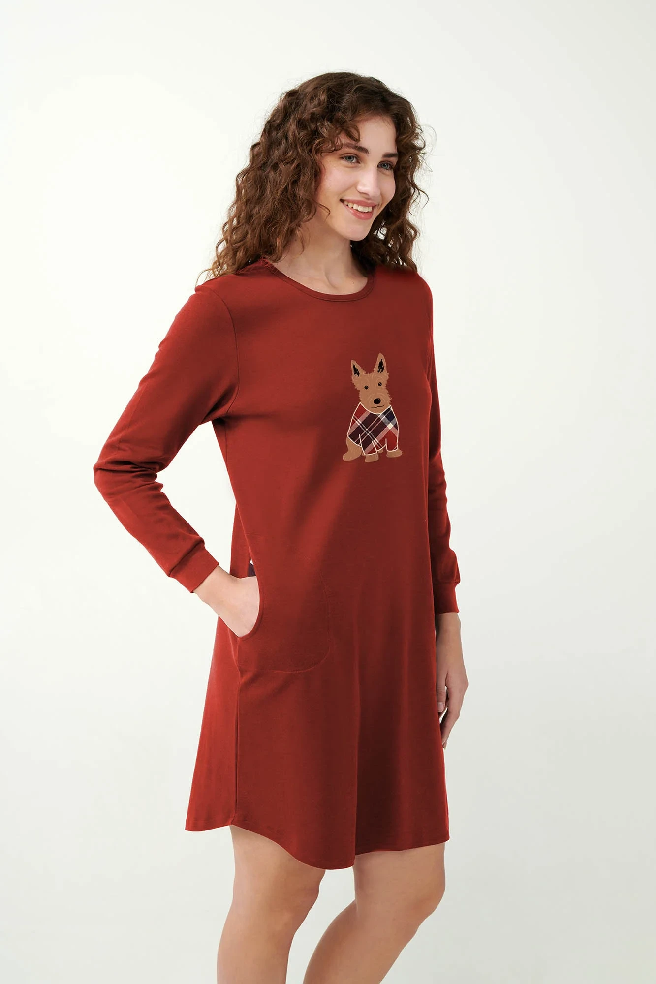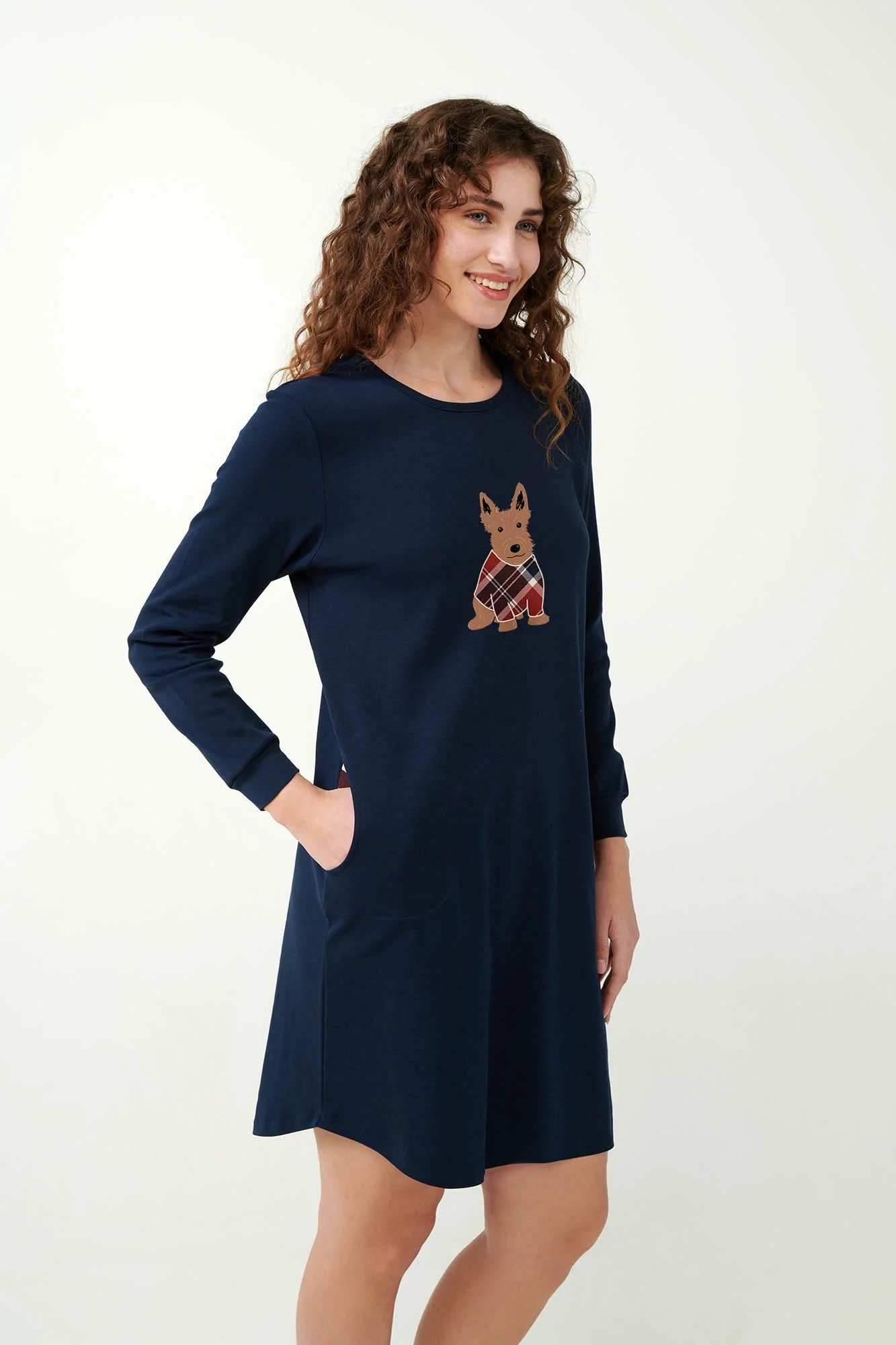 Objevte pohodlí a styl s naší rozkošnou noční košilí. Tato noční košile s roztomilým potiskem skotského teriéra na hrudi dodá vašemu spánku hravý nádech. Kapsy jsou potaženy klasickým tartanovým vzorem, který vytváří dokonalou kombinaci šarmu a rafinovanosti. Je vyrobena z měkké, 100% bavlněné interlokové tkaniny a zajistí klidný spánek. Pravidelný střih nabízí pohodlnou a lichotivou siluetu.