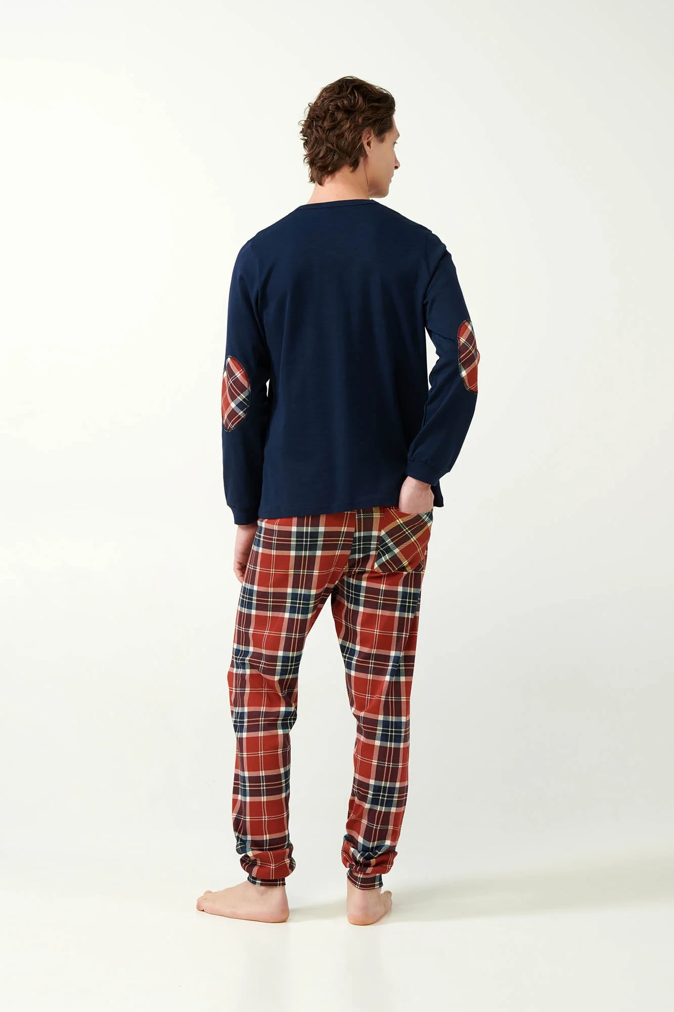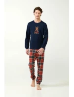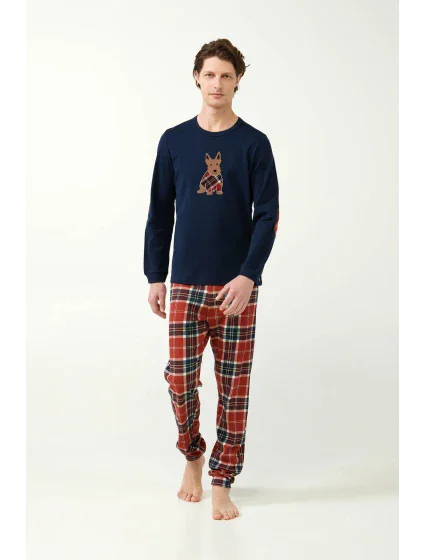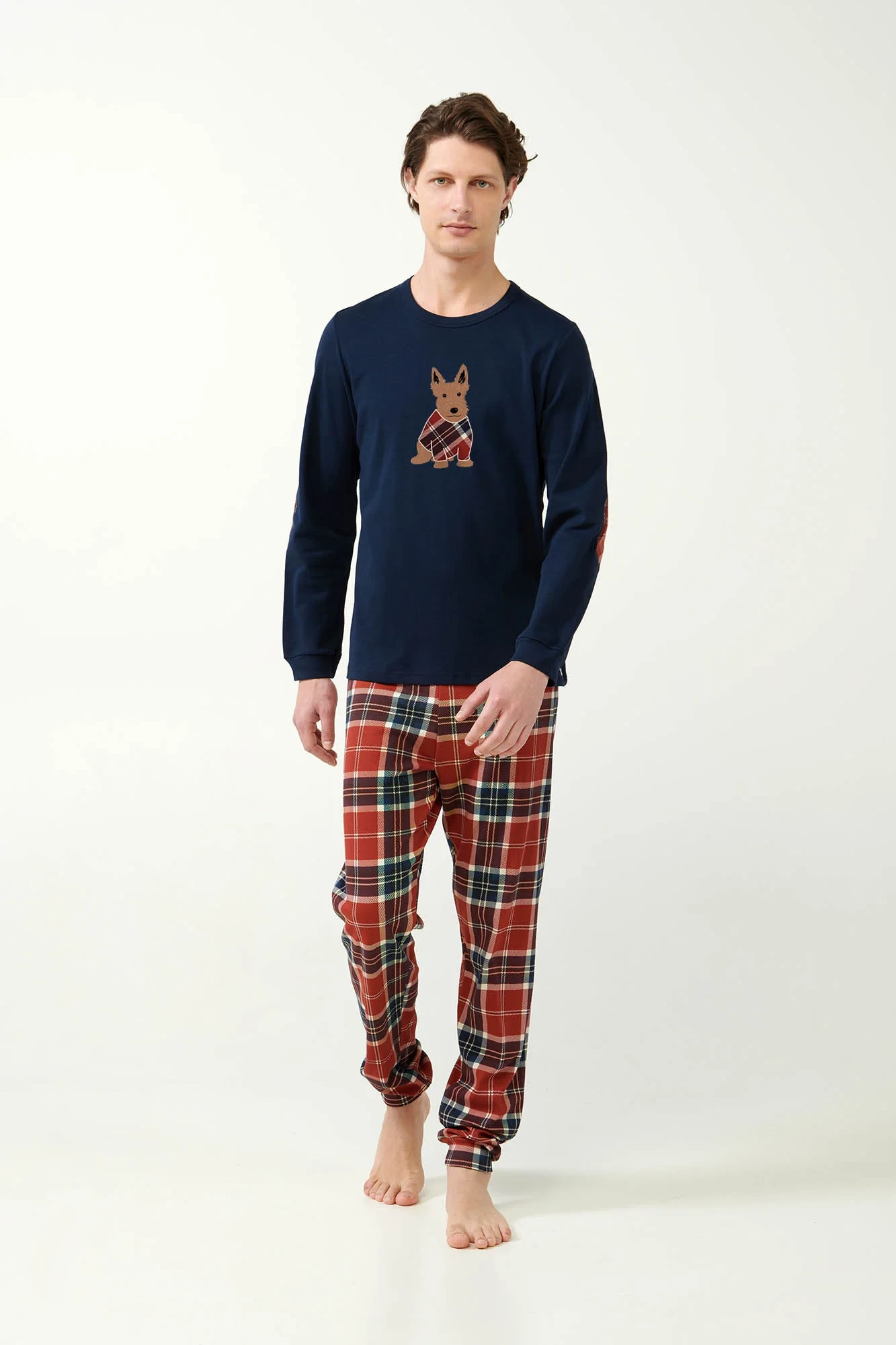 Oslavte sezónu v pohodlí s naším pánským pyžamovým kompletem. Tato souprava s červenými a modrými tartanovými kalhotami s manžetami a útulným topem s manžetami s hravým potiskem skotského teriéra na hrudi je ideální pro vánoční rána nebo líné zimní večery. Je vyrobena ze 100% bavlněného interlocku pro měkkost a hřejivost a nabízí regular fit střih, který je ideální pro odpočinek s rodinou během svátků.