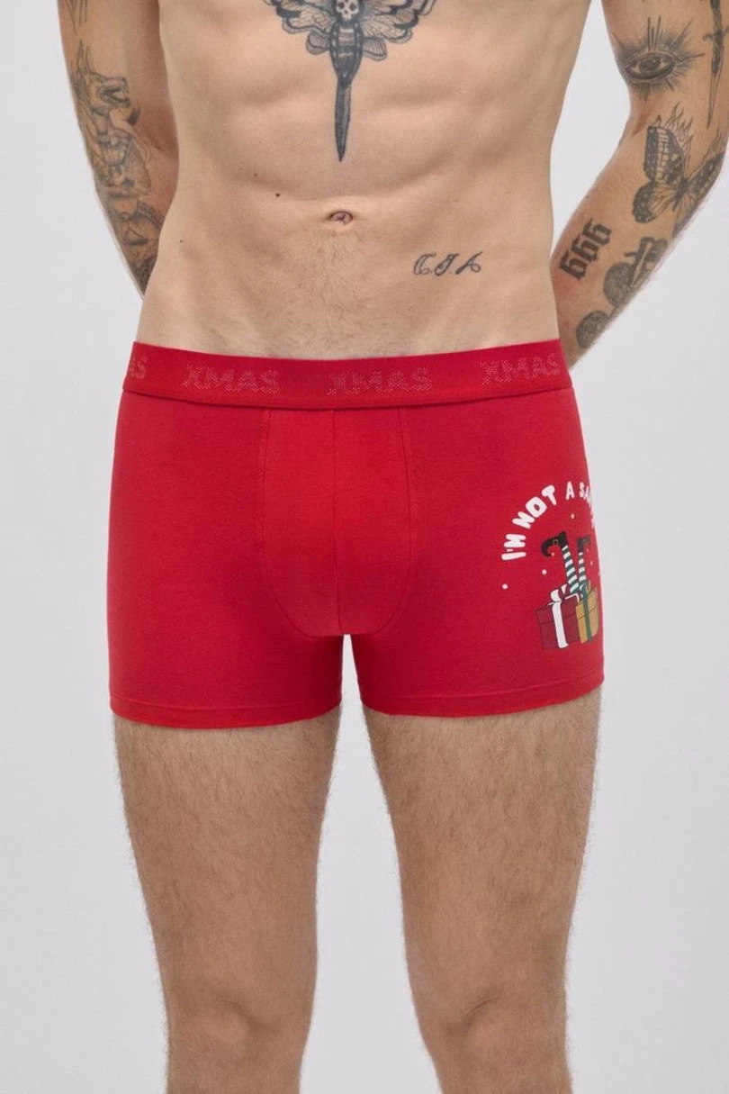 Červené pánské boxerky z vánoční kolekce jsou kombinací pohodlí a humoru. Jsou vyrobeny z kvalitní, prodyšné bavlny s přídavkem elastanu, perfektně padnou a poskytují naprosté pohodlí. Potisk zobrazující vánoční dárky a vtipný nápis „I’not a Santa” dodává spodnímu prádlu jedinečný charakter a je ideální jako originální vánoční dárek. Široká guma s nápisem „XMAS” udržuje boxerky na svém místě, zatímco ploché švy zajišťují pohodlí po celý den.