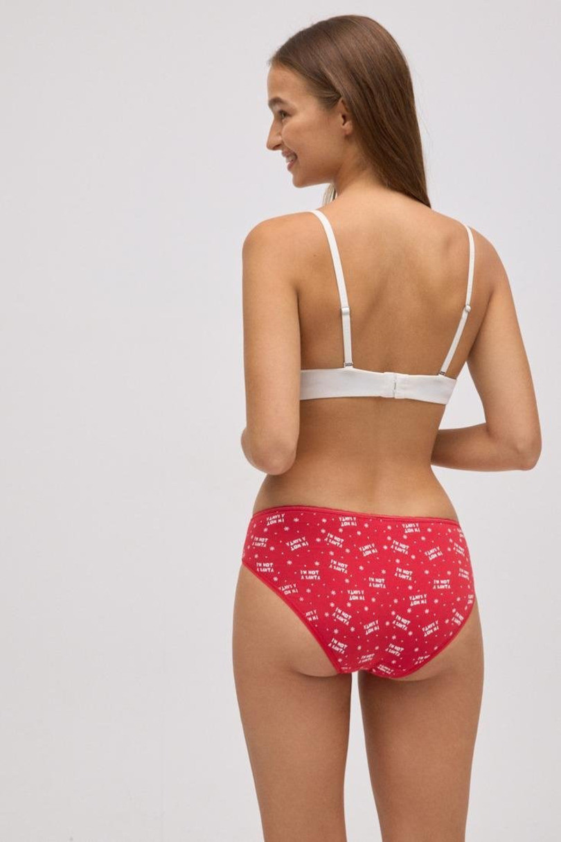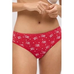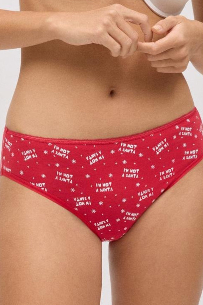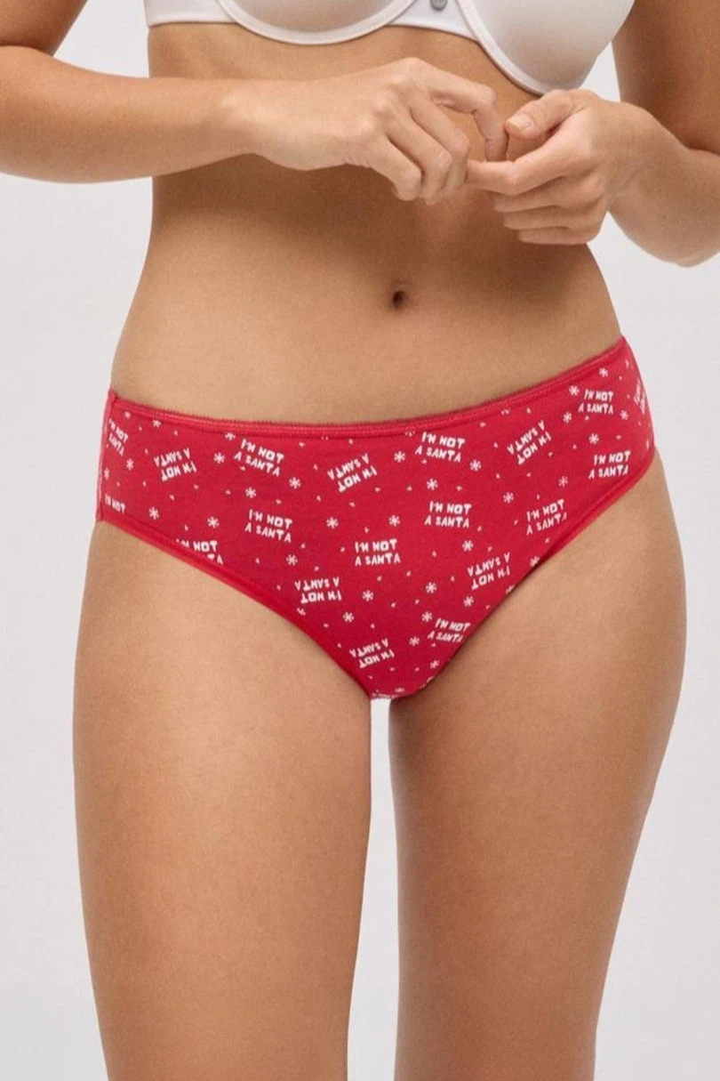 Świąteczne majtki damskie w intensywnie czerwonym kolorze to połączenie wygody i świątecznego humoru. Wykonane z miękkiej, oddychającej bawełny z dodatkiem elastanu, gwarantują idealne dopasowanie i komfort noszenia przez cały dzień. Model ozdobiony jest drobnym nadrukiem z napisem „I’m not a Santa” oraz motywem śnieżynek, co nadaje im wyjątkowego uroku. Klasyczny krój zapewnia wygodę i swobodę ruchów, a elastyczna talia sprawia, że bielizna doskonale układa się na sylwetce. To świetny wybór na zimowe dni lub jako uroczy prezent świąteczny.