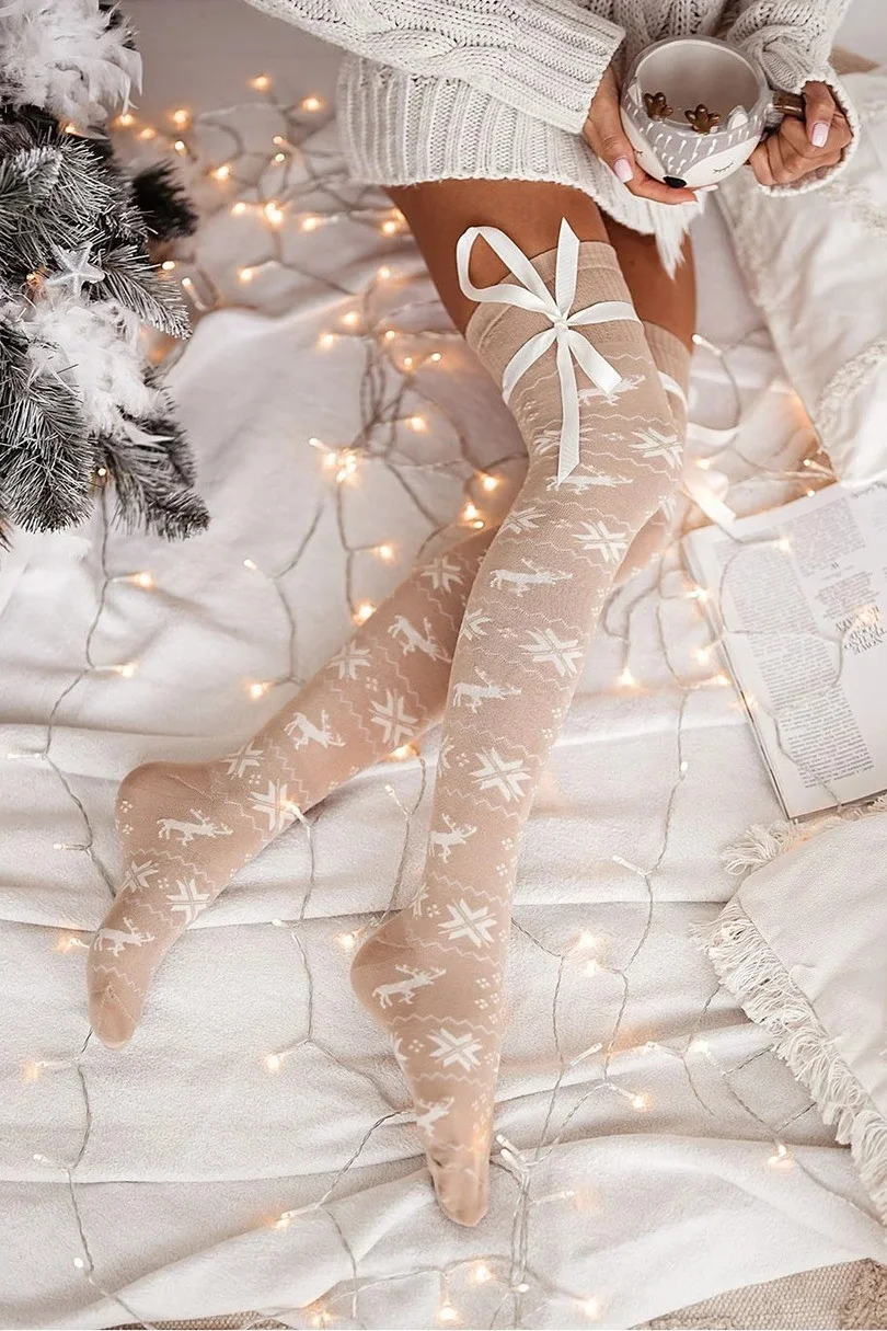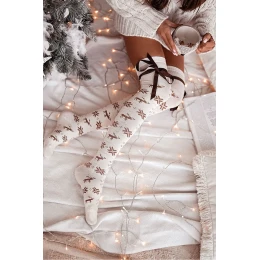Zakolanówki damskie bawełniane, ozdobione świątecznym wzorem. Posiadają płaskie szwy oraz nieuciskający ściągacz, co zapewnia wygodę i komfort noszenia. Wykończone ozdobną tasiemką do wiązania kokardki.