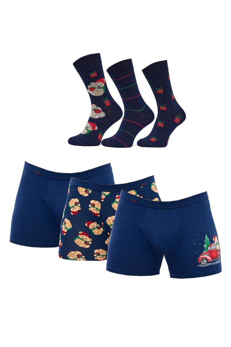 Zestaw męski Cornette to idealne połączenie komfortu, jakości i świątecznego charakteru. W komplecie znajdują się trzy pary bokserek oraz trzy pary skarpet, utrzymane w spójnej kolorystyce granatu i ozdobione uroczymi bożonarodzeniowymi motywami, takimi jak misie, prezenty czy klasyczna ciężarówka z choinką. To zestaw, który świetnie sprawdzi się zarówno jako prezent, jak i praktyczny element garderoby na zimowy sezon. Bokserki wykonane są z wysokogatunkowej bawełny z dodatkiem elastanu, co gwarantuje idealne dopasowanie, swobodę ruchów i maksymalny komfort użytkowania. Guma w pasie została obszyta bawełną, dzięki czemu nie uciska i nie powoduje podrażnieńEAN čárové kódy zboží jsou: