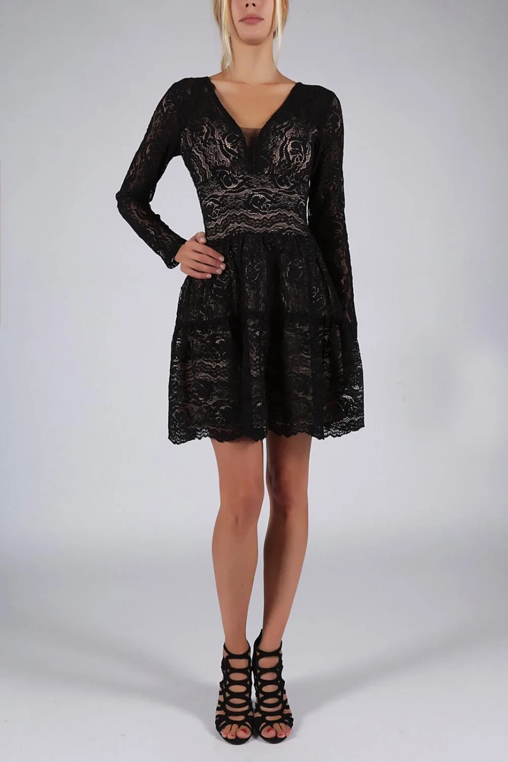 Krajkové šaty s dlouhými rukávy v černé barvě. Šaty s jemně rozšířeným spodním dílem. Šaty se zapínají na krytý zip. Ideální pro mnoho příležitostí.