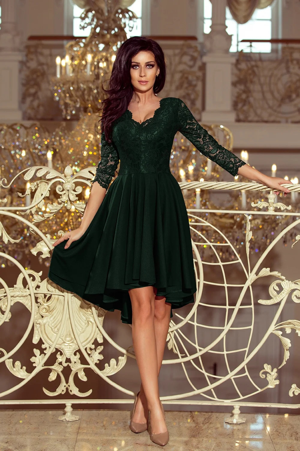 Asymetrické tmavě zelené exkluzivní šaty Nicolle s delšími zády, 3/4 rukávy, výstřihem a krajkou. Sukně s delším zadním dílem bude ideální pro tanec. Vyrobeno v Polsku.