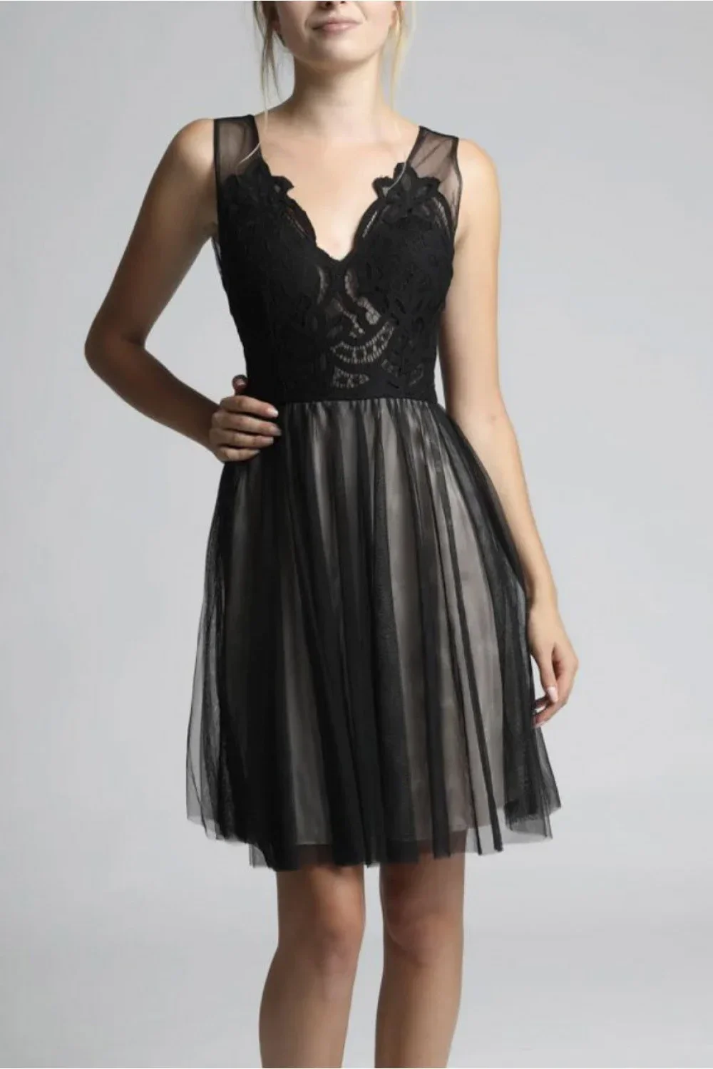 Elegantní šaty s hlubokým výstřihem, zapínané na krytý zip. Šaty jsou vyrobeny z tylu a krajky. Skvěle se hodí pro mnoho příležitostí.