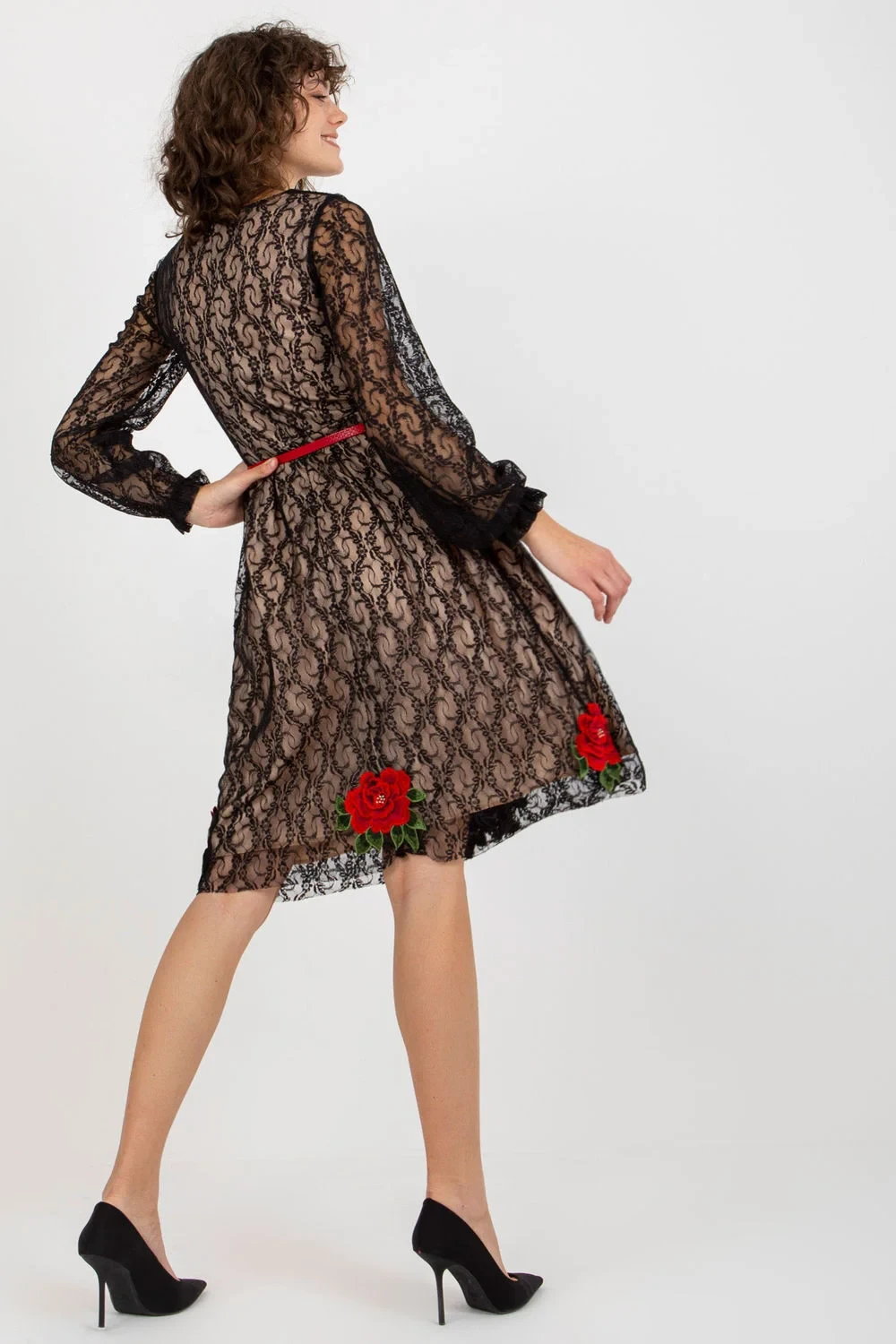 Krajkové šaty s dlouhými rukávy a podšívkou. Šaty se zapínají na krytý zip a v pase mají pásek. Šaty zdobené našitými květinami.
