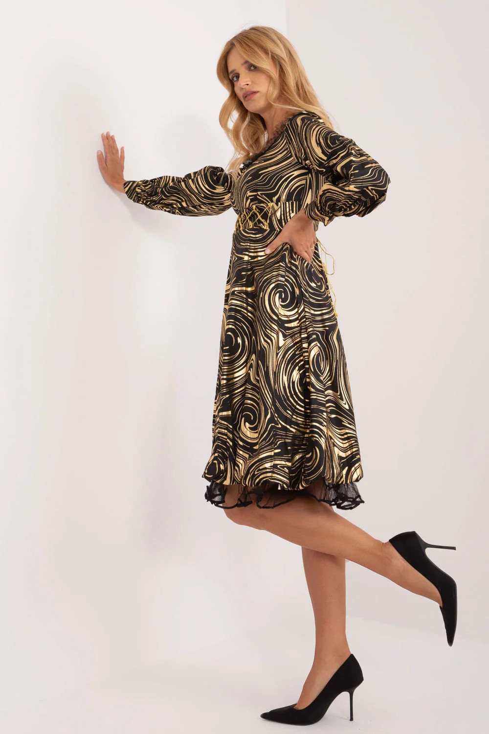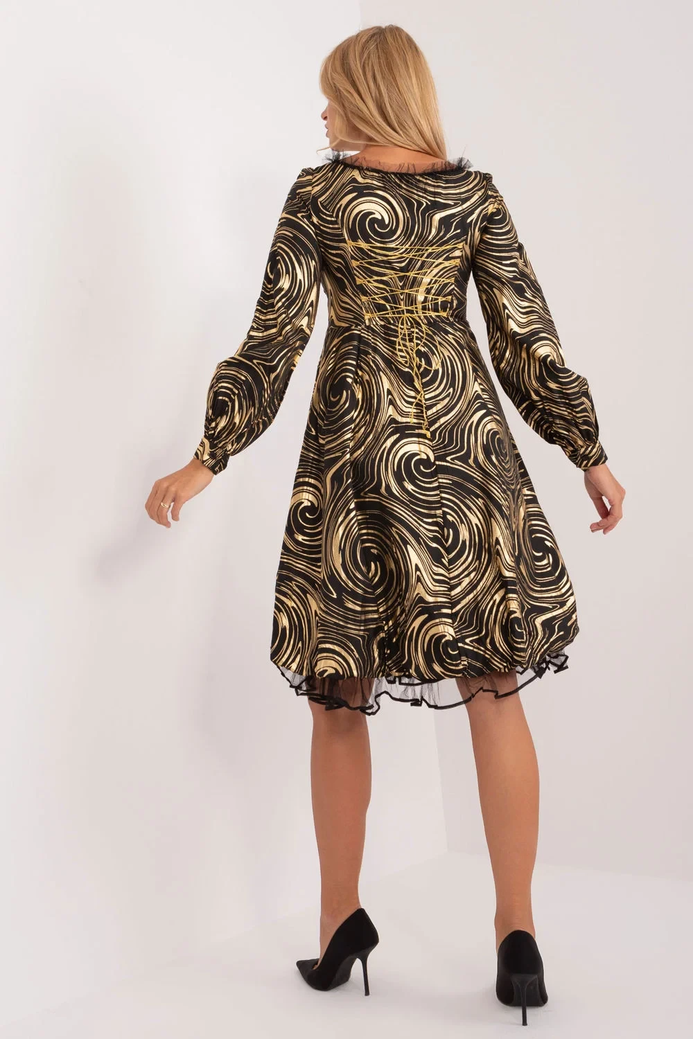 Večerní šaty, které jsou výrazem luxusu a elegance, jsou ideální pro zvláštní příležitosti, jako jsou elegantní večírky, slavnostní vycházky nebo události. Jejich rozšířený střih dodává lehkost a ženský půvab a vytváří nápadný styling. Použitý zajímavý potisk dodává šatům individuální charakter a přispívá k jejich jedinečnému výrazu. Šaty jsou vyrobeny z vysoce kvalitního polyesteru a zaručují nejen okouzlující vzhled, ale také pohodlné nošení. Díky délce pod kolena jsou šaty ideální pro večerní vycházky a zároveň umožňují jemně zvýraznit nohy. Dlouhý bufetový rukáv dodává šatům eleganci a jedinečný styl a zároveň umožňuje přizpůsobit se různým povětrnostním podmínkám. Kulatý výstřih je univerzální a nadčasový, zatímco zapínání na zip umožňuje šaty snadno oblékat a svlékat. Ozdobné vázání v pase a na zádech zvýrazňuje pas a dodává šatům jemný nádech. Podšívka zaručuje další pohodlí a celek vytváří harmonický obraz večerní elegance. Tyto večerní šaty jsou ideální volbou pro ženy, které chtějí zaujmout svým vzhledem na výjimečných událostech a zároveň zdůraznit svou individualitu.