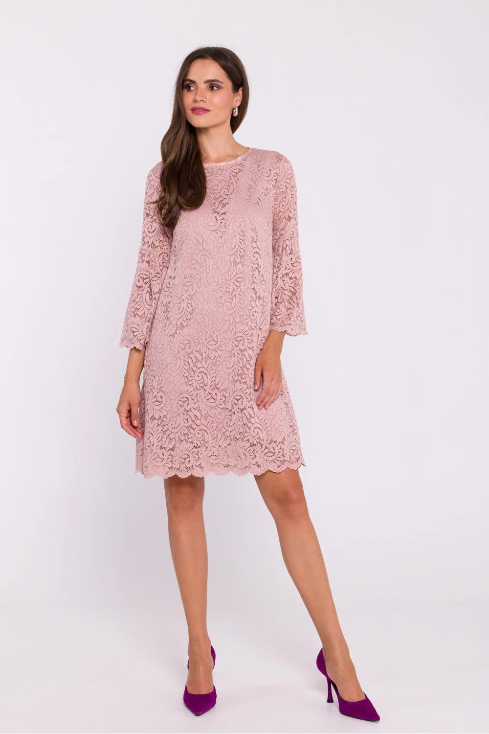 Jedinečné dvouvrstvé šaty s lichoběžníkovým střihem, které kombinují klasickou eleganci s romantickými detaily. Ve spodní části jsou vyrobeny z hladké látky, zatímco vnější vrstvu tvoří jemná krajka, která celému vzhledu dodává jemný a sofistikovaný nádech. Rukávy v délce k loktům jsou zakončeny půvabným volánkem, který vnáší do šatů lehkost a ženský nádech. Šaty v délce ke kolenům poskytují pohodlí a volnost pohybu. Nosí se přes hlavu a mají diskrétní zapínání na zádech pro snadné oblékání. Jsou navrženy a ušity v Polsku a zaujmou kvalitou zpracování a důrazem na detail. Ideální pro zvláštní příležitosti, kdy se chcete cítit stylově a elegantně.