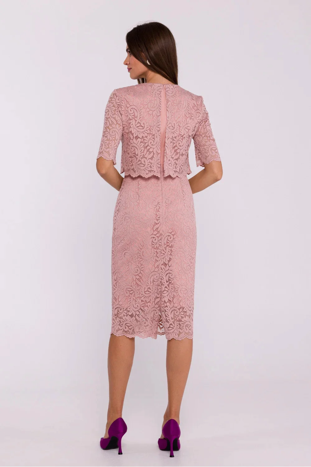 Elegantní dvouvrstvé tužkové šaty, které kombinují klasickou hladkou látku ve spodní části s jemnou krajkovou vnější vrstvou a vytvářejí tak elegantní a ženský vzhled. Šaty jsou v pase vykrojené, což zvýrazňuje pas a dodává siluetě proporce. Krátké krajkové rukávy dodávají šatům lehkost a jemný půvab. Délka pod kolena a rozparek na zádech zajišťují pohodlí a volnost pohybu a zároveň zdůrazňují elegantní charakter střihu. Krytý zip na zádech umožňuje diskrétní přizpůsobení postavě. Šaty byly navrženy a ušity v Polsku, což je zárukou nejvyšší kvality zpracování a důrazu na detail. Ideální pro zvláštní příležitosti, kdy chcete vypadat elegantně a na úrovni.