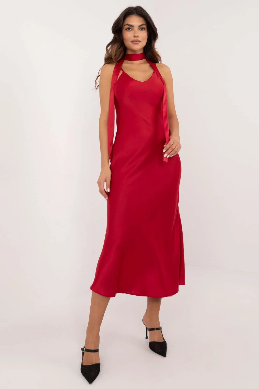 Elegantní večerní šaty ve střihu mořské panny jsou výjimečnou volbou pro zvláštní příležitosti. Jsou vyrobeny z převažující kombinace viskózy a polyesteru, poskytují pohodlí a jemný lesk, což podtrhuje elegantní charakter této kreace. Střih šatů je rozšířený, což dodává lehkost a volnost a zároveň zdůrazňuje ženskou siluetu. Délka šatů sahá do poloviny lýtek, což jim dodává jemnou eleganci, ideální na formální schůzky nebo večerní večírky. Šaty jsou bez ramínek a mají hluboký výstřih do V, takže krásně odhalují dekolt a ramena. Šaty mají na boku praktické zapínání na zip, které usnadňuje jejich oblékání. Mezi další prvky patří podšívka pro větší pohodlí a pásek na zavazování v pase pro lepší přizpůsobení. Díky hladkému vzoru a sofistikované jednoduchosti jsou tyto šaty ideální volbou pro elegantní vycházky.