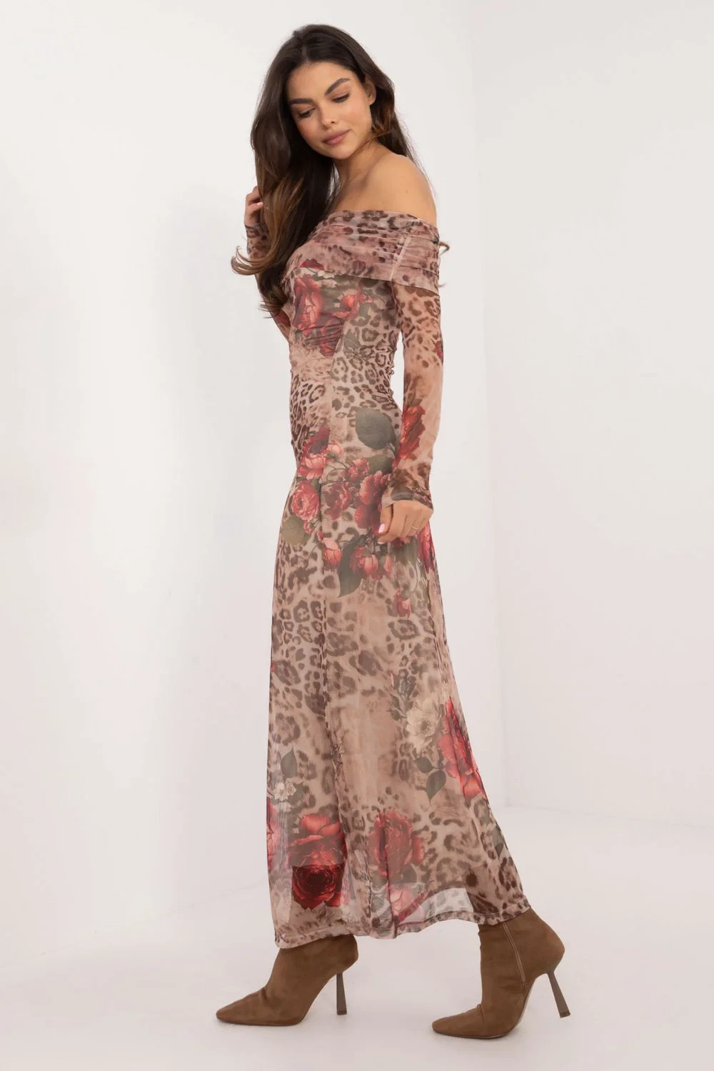 Tato jedinečná úzká šaty jsou must-have v šatníku každé módní ženy. Její univerzální střih a vzor s motivem zvířecího tisku s květinami z ní dělají ideální volbu jak na každý den, tak na speciální příležitosti. Lehký polyesterový materiál s podšívkou zajistí pohodlí po celý den. Španělský výstřih krásně zdůrazňuje ramena a midi délka opticky prodlužuje nohy. Tyto šaty jsou investicí do vašeho šatníku. Její všestrannost a zajímavý vzor vám umožní vytvořit mnoho jedinečných stylizací. Bez ohledu na to, jestli jdete na setkání s přáteli nebo na romantickou večeři, tyto šaty vždy budou vhodné.