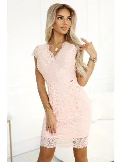 Sentimentální a elegantní šaty, které zdůrazňují ženskou siluetu. Vyrobené z jemné, pružné krajky, jemně obepínají tělo, zdůrazňujíce přednosti postavy. Hluboký výstřih jí dodává lákavý charakter a krátké rukávy dodávají lehkost a eleganci. Broskvový odstín zdůrazňuje přirozenou krásu a dodává kreaci romantického šarmu. Ideální na speciální příležitosti, které vám zajistí sebejistotu a ohromující vzhled. Polský produkt. Značka Numoco.