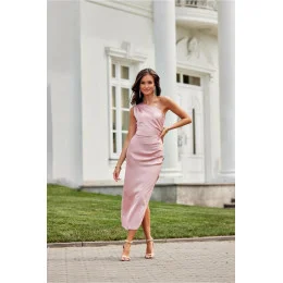 Midi šaty na jedno rameno s jemným rozparkem na nohavicích jsou vyrobeny z jemné saténové tkaniny. Na boku je řasení, které dokonale zakryje případné nedokonalosti. Široké ramínko s řasením na jednom rameni jim dodává jedinečný charakter. Zapínají se na krytý zip na boku šatů. Tyto midi šaty jsou nejen elegantní, ale také funkční. Midi délka dodává šatům rafinovaný, ženský styl. Tento střih šatů vám umožní cítit se originálně tím, že zdůrazní váš osobitý styl, a jistě upoutá pozornost tím, že vás odliší z davu, ať už se jedná o jakoukoli příležitost. Výrobek je vyroben a ušit v Polsku.