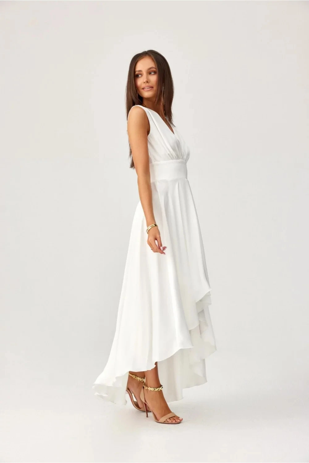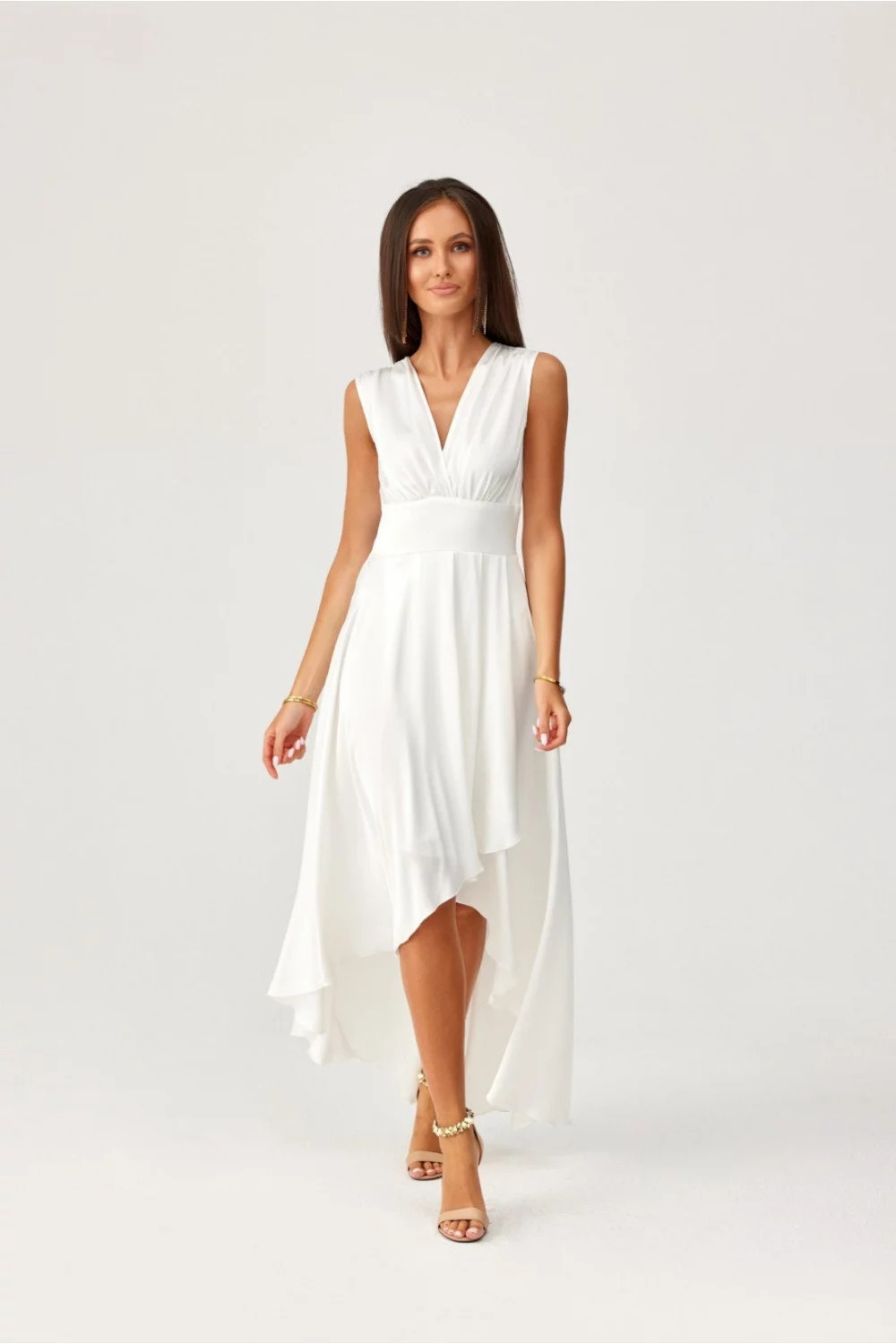 Maxi šaty jsou vyrobeny z třpytivé saténové látky. Asymetrický lem a hluboký výstřih dodávají šatům jemnou ženskost a rozšířený střih zajišťuje volnost pohybu. Večerní šaty mají krásný obálkový výstřih, který opticky prodlužuje naši siluetu a krásně zvýrazňuje poprsí. Široký pas se v pase zužuje, což krásně zdůrazní ženské přednosti. Maxi šaty se vyznačují také asymetrickým střihem, který umožňuje ukázat nohy. Šaty se zapínají na krytý zip na zádech modelu. Výrobek je vyroben a ušit v Polsku.