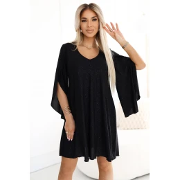 Olšňující světlem a elegancí v každé situaci. Tento trapezový šaty značky Numoco je ideální volbou pro speciální příležitosti, od večerních vycházek po elegantní události. Vyrobena z černého elastického materiálu s třpytkami brokátu, krásně se třpytí ve světle a dodává stylizaci luxusního charakteru. Volný, volný střih ve tvaru písmene A skvěle padne na postavě a maskuje nedokonalosti, a efektní motýlové rukávy dodávají šatičce lehkost a módní šmrnc. Výstřih ve tvaru písmene V jemně zdůrazňuje krk a zúžuje horní část těla.