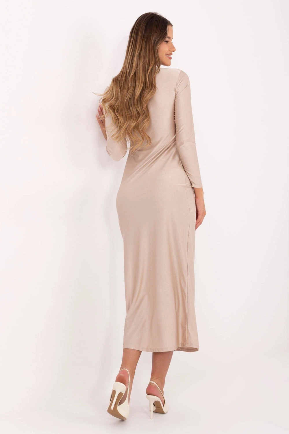 Elegantní šaty ve stylu ceruzky, které okouzlují smyslným a zároveň stylovým charakterem. Vyrobené z viskózy s příměsí polyesteru, krásně se přizpůsobují postavě, zdůrazňujíce ženské tvary. Hladký materiál dodává celku eleganci a midi délka dělá kreaci neuvěřitelně stylovou. Model se vyznačuje hlubokým rozštěpem na levé straně až po stehno, což přidává odvážný akcent a zdůrazňuje nohy. Vložené zpevněné košíčky zajistí ideální přizpůsobení a pohodlné nošení. Výstřih do srdce zdobený kovovou aplikací a jemným mašlováním jemně zvýrazňuje poprsí a dodává kreaci elegantní zakončení. Šaty nemají zapínání, díky čemuž jsou snadno obléknutelné a pohodlné na nošení. Jsou to ideální volba na společenské události a výjimečné akce, kdy chcete vypadat efektně a s elegancí.