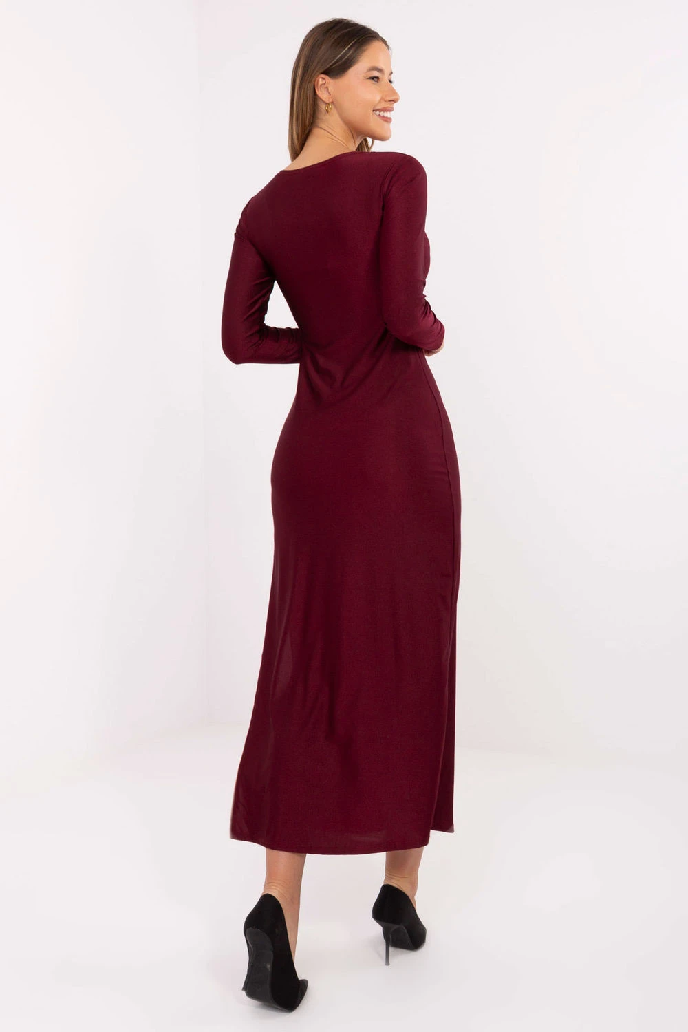 Elegantní šaty s olověným střihem, které okouzlují smyslným a zároveň elegantním charakterem. Vyrobené z viskózy s příměsí polyesteru, krásně se přizpůsobují postavě, zdůrazňujíce ženské tvary. Hladký materiál dodává celku eleganci a midi délka dělá kreaci velmi stylovou. Model se vyznačuje hlubokým rozparkem na levé straně až po stehno, který přidává odvážný akcent a zdůrazňuje nohy. Vsazené košíčky s vycpávkami zajišťují dokonalé přizpůsobení a pohodlí nošení. Výstřih do podkovy zdobený kovovou aplikací a jemným zvrásněním jemně exponuje poprsí a dodává kreaci elegantní dokončení. Šaty nemají zapínání, díky čemuž jsou snadné na oblékání a pohodlné na nošení. To je ideální volba na společenské události a výjimečné večírky, kdy chcete vypadat efektně a s elegancí.