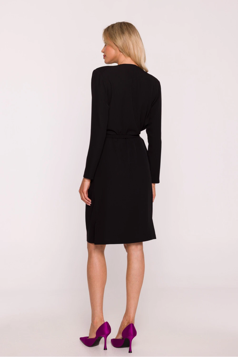 Elegantní tužkové šaty vyrobené z hladké látky s jemným, lehce lesklým povrchem. Model okouzluje smyslným výstřihem ve tvaru vody, který se jemně přizpůsobuje siluetě, zdůrazňujíc ženský charakter šatů. Dlouhé rukávy dodávají celku eleganci a zajišťují, že kreace se skvěle hodí jak na večerní vycházky, tak na elegantní setkání. Střih s volnějším vrchním dílem a se zužujícím se dnem krásně tvaruje postavu, a elastický pás z téže látky zdůrazňuje pas. Spodní část šatů má jednoduchý střih s jemným rozparkem po straně, který zajišťuje volnost pohybu. Šaty nemají zapínání, nasazují se pohodlně přes hlavu. Navrženo a ušito v Polsku s důrazem na každý detail.