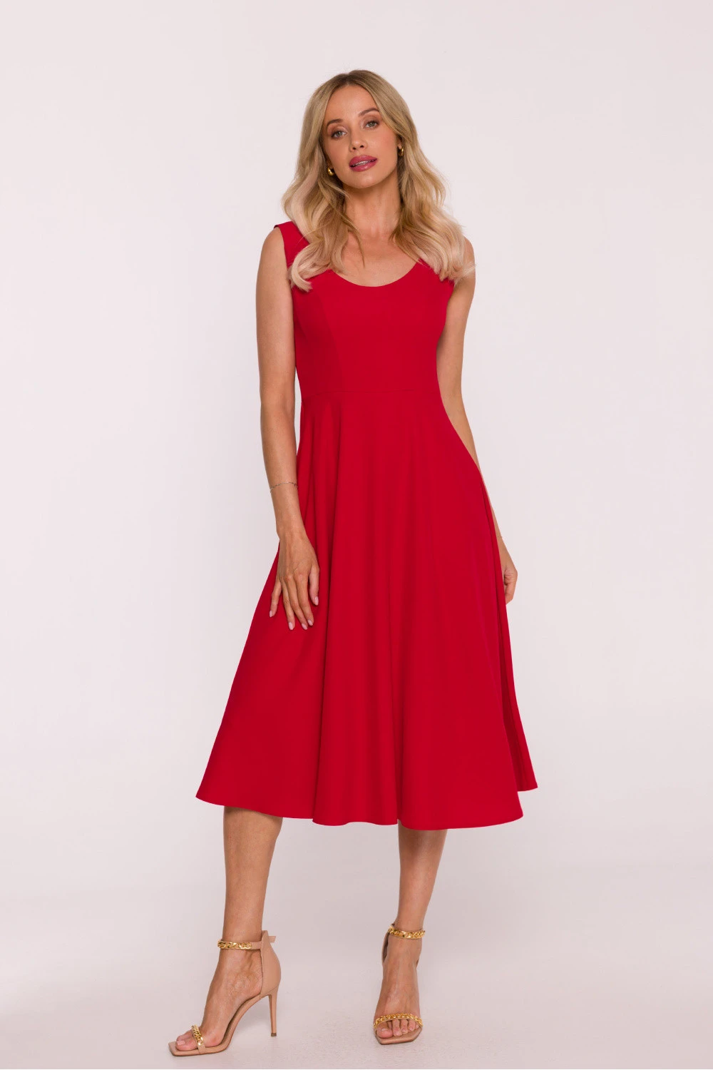 Klasické rozšířené šaty jsou kvintesencí ženské elegance a nadčasového stylu. Vyrobené z hladké látky s jemným leskem krásně odrážejí světlo a jemně zdůrazňují stylizaci. Model má jednoduchý, kulatý výstřih a bezrukávkový střih, díky čemuž vypadá lehce a elegantně. Přiléhavý vršek plynule přechází do rozšířeného spodku, který se volně skládá s každým pohybem, dodávající postavě grácii a lehkost. Pas je zdůrazněn precizním střihem, který opticky zeštíhlí postavu a zdůrazní její proporce. Vzadu je umístěný skrytý zip, zajišťující pohodlné oblékání a hladký dokončení. Navrženo a ušito v Polsku s důrazem na detaily a kvalitu zpracování.