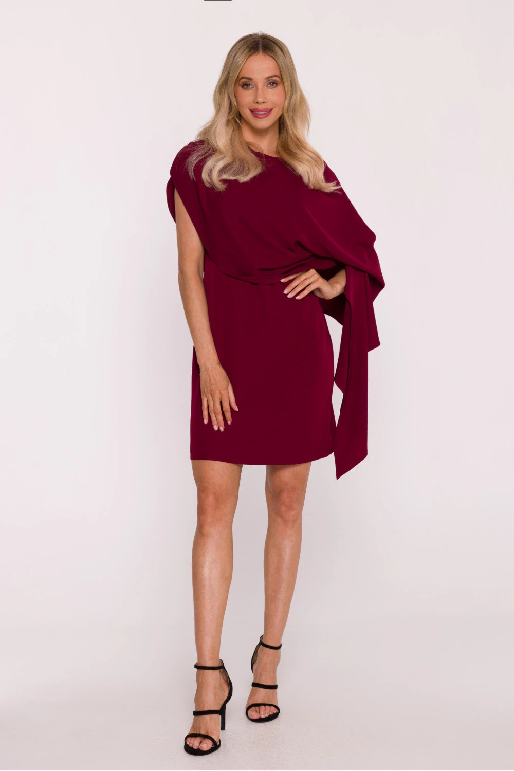 Elegantní koktejlové šaty s dekorativní pelíškem jsou výjimečným návrhem pro ženy, které oceňují moderní formu a decentní lesk. Vyrobené z hladké látky s lehkým leskem, okouzlují svou jednoduchostí a efektními detaily. Model vyniká kulatým výstřihem a asymetrickým, volně padajícím pelíškem, který vytváří stylové, smyslné rameno a dodává celku lehkost. Jednoduchý, lehce přizpůsobený spodek krásně zdůrazňuje postavu, zatímco zachovává pohodlí nošení. Na boku je diskrétně umístěný skrytý zip, který zajišťuje pohodlí při oblékání a elegantní dokončení. Decentní lesk látky přidává kreaci eleganci, což z ní dělá skvělou volbu pro večírky, slavnostní události nebo večerní vycházky. Navrženo a ušito v Polsku s důrazem na každý detail.