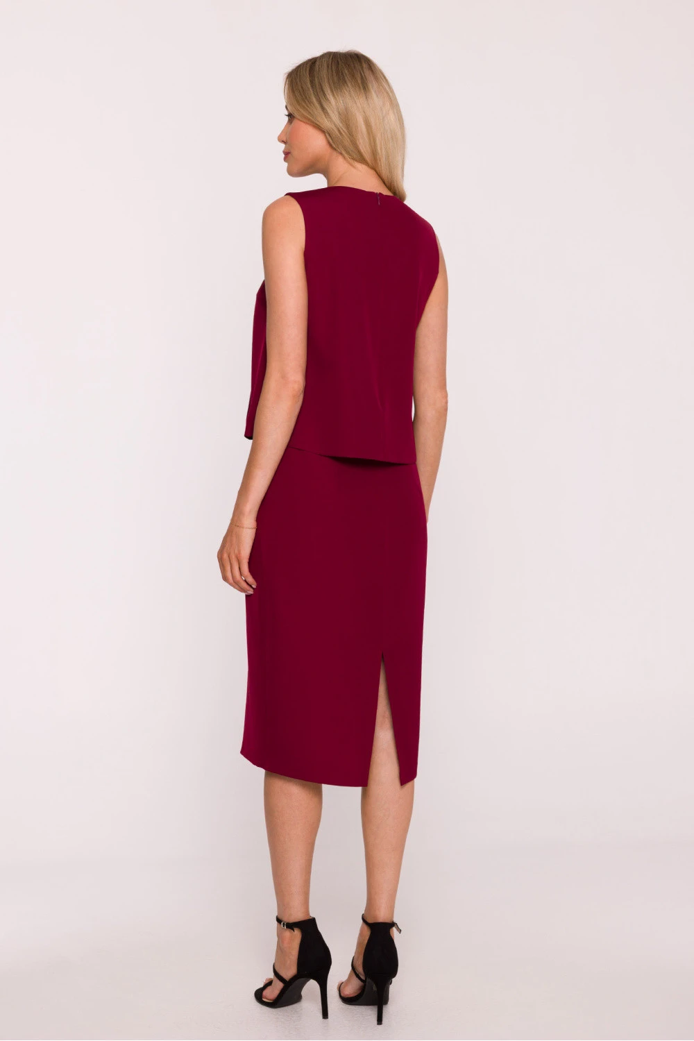 Elegantní úzké šaty s dvouvrstvým vrškem jsou spojením elegance, ženskosti a jemné elegance. Vyrobené z hladké látky s jemným leskem, krásně zdůrazňují postavu, zachovávajíce přitom lehkost a pohodlí nošení. Model láká výstřihem ve tvaru písmene V, ozdobeným vložkou z jemné krajky, která dodává celku romantický charakter. Bezrukávový střih dodává šatům lehkost, a dvouvrstvý vršek s volně padající vrstvou látky jemně maskuje oblasti pasu a boků, vytvářejíc harmonickou linii postavy. Úzký dolní díl je přizpůsoben tělu a zakončen rozparkem vzadu, který zajišťuje pohodlnost pohybů. Šaty se zapínají dvěma skrytými zipy vzadu, což zaručuje ideální přizpůsobení a estetické provedení. Navrženo a ušito v Polsku s důrazem na každý detail.