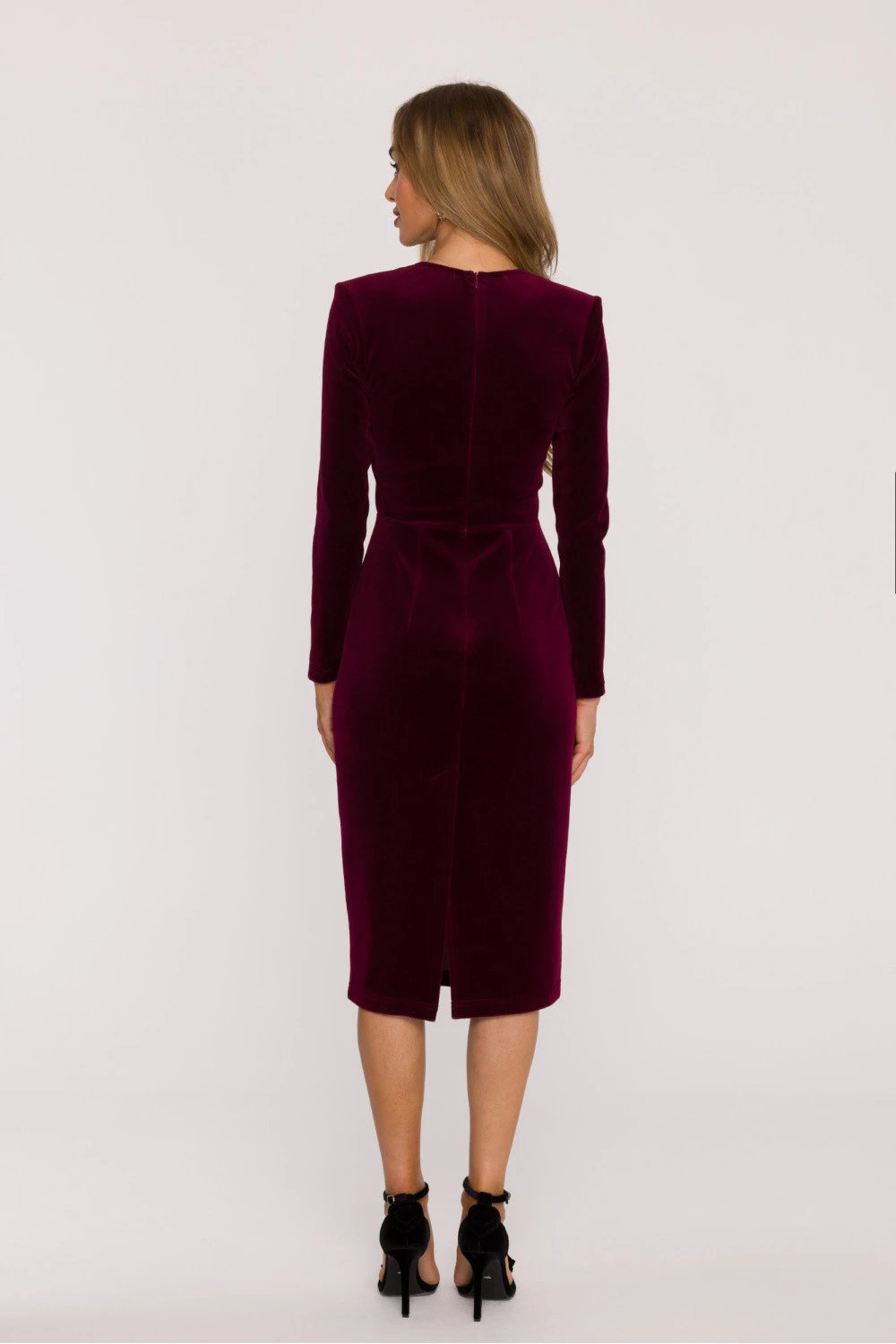 Klasické a smyslné středně dlouhé sametové šaty, které spojují eleganci s nadčasovou jednoduchostí. Vyrobena z měkkého, příjemného na dotek sametového úpletu, krásně odráží světlo, vytváří subtilní, luxusní lesk. Model okouzluje hlubokým výstřihem do srdce, který zdůrazňuje ženskou siluetu a dodává celku eleganci. Dlouhé, přímé rukávy přinášejí rovnováhu do střihu, dodávají mu elegantní a vyvážený charakter. Šaty mají přiléhavý olivový střih, s jasně vyznačenou talií a délkou za koleno, co opticky zúží postavu a bude skvěle ladit jak do večerních stylizací, tak na speciální příležitosti. Model nemá kapsy ani podšívku, díky čemuž si zachovává lehkost a pružnost. Skrytý zip vzadu usnadňuje oblékání a zajišťuje dokonalé přizpůsobení tělu. Šaty navrženy a ušity v Polsku s pečlivostí o každý detail, ideální volba pro ženy, které oceňují klasickou eleganci a pohodlí nošení.