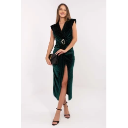 Elegantní, ženské olověná suknička midi délky, navržená pro speciální příležitosti. Vyrobena z vysoce kvalitní směsi polyesteru a elastanu, zaručuje perfektní přiléhavost a pohodlí při nošení. Model se vyznačuje šitými polštářky na ramenou, které dodávají siluetě elegantní, výrazný tvar. Záhyb výstřihu krásně zdůrazňuje linii poprsí a rozpark na přední straně jemně vystavuje nohu, přidávajíce celku smyslný charakter. Na přední straně jsou záhyby s kovovou ozdobou, které opticky zúží pas a tvoří efektní detail. Sukně bez rukávů, bez zapínání, s flitry je nadčasová, ideální na návštěvy, večírky a elegantní přijetí.