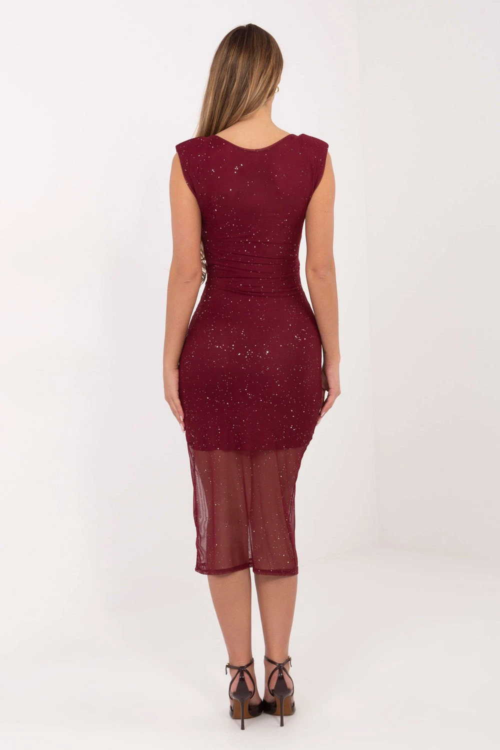 Tato jedinečná koktejlová šaty okouzlují kombinací lesklého síťování a klasického, ceruzkového střihu. Vyrobené z vysoce kvalitního polyesteru a viskózy se krásně přizpůsobují postavě, zdůrazňují její tvar a délka midi dodává celkové eleganci ideální pro návštěvy a večírky. Výstřih do V jemně zdůrazňuje linii krku a ozdobné brože umístěné pod ním dodávají šatičce jemný lesk a rafinovaný charakter. Díky absenci rukávů vypadá model lehce a moderně, a vestavěné polštářky na ramenou zaručují efektní a harmonickou linii postavy. Přední část kreace zdobí elegantní záhyby, které nejen zpestřují vzhled, ale také opticky modelují postavu. Šaty jsou vybaveny podšívkou z 95% viskózy a 5% elastanu, co zajišťuje pohodlí nošení, dostatečnou pružnost a ideální přizpůsobení tělu. Model nemá žádné zapínání, což z nich činí praktické a pohodlné k nasazení. Elegantní, smyslné a plné lesku, ideální na speciální příležitosti, kdy chcete vypadat oslnivě.