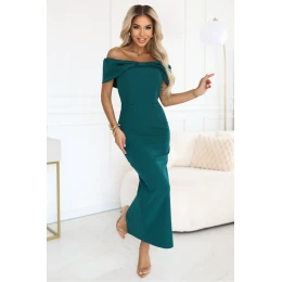 Jedná se o jeden z těch šatů, které udělají dojem, aniž byste cokoli řekli. Hluboká zelená barva láhve, odkrytá ramena a každý detail dokonale propracované mašle vytváří styl, který přitahuje pohledy a zdůrazňuje ženskou sebejistotu přirozeně, bez přehánění. Off-shoulder linie jemně zdůrazňuje ramena a přizpůsobený střih jemně tvaruje siluetu, vytvářejíc efekt WOW bez nepohodlí. Přesné střihy tvarují pas a mašle na výstřihu dodává kreaci elegantního a ženského charakteru. Materiál se skládá tak, jak by měl: hladce, stabilně, s elegancí. Díky rozříznutí vzadu se můžete pohybovat volně - každý krok je jistý a šaty zdůrazňují pohyb boků s jemnou, nesmírně smyslnou jemností. Ideální, když vstoupíte do místnosti a chcete, aby okamžik patřil vám. Jedná se o projekt vyrobený z elegantní látky, která si udržuje tvar a neprosvítá. Dokonalý polský výrobek od značky Numoco, kde se cení kvalita, přesnost a ženská estetika. Produkt je 100% polský.