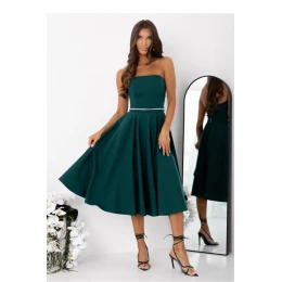Elegantní šaty bez ramínek jsou návrhem, který spojuje klasický střih s efektními detaily. Model se zapíná na skrytý zip umístěný na levé straně, co zajišťuje pohodlné oblékání a estetické dokončení. Pas je zdůrazněn ozdobným páskem s flitry, který celku dodává lesk a jedinečný charakter. Rozkročený spodek se krásně skládá v pohybu, dodávající siluetě lehkost a dívčí půvab. Na zádech je praktické šněrování umožňující regulaci přizpůsobení. Navíc jsou do šatů vsazeny pásky umožňující připevnění ramínek dle vlastních potřeb (ramínka nejsou součástí). Jedná se o ideální volbu na slavnostní události, večírky a speciální příležitosti.