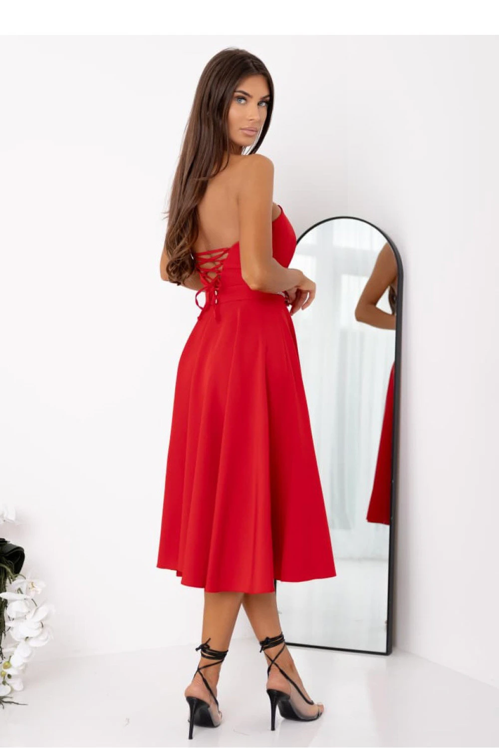 Elegantní šaty bez ramínek jsou návrh, který spojuje klasický tvar s efektními detaily. Model se zapíná na skrytý zip umístěný na levé straně, co zajišťuje pohodlí a estetické provedení. Pas je zdůrazněn ozdobným páskem s flitry, který dodává celku lesk a výjimečný charakter. Rozkročený spodek se krásně skládá v pohybu, dodávající siluetě lehkost a dívčí šarm. Na zádech je praktické šněrování umožňující regulaci přizpůsobení. Kromě toho jsou do šatů vsazeny pásky umožňující připevnění ramínek podle vlastních potřeb (ramínka nejsou přiložena). To je ideální volba na slavnosti, večírky a výjimečné příležitosti.