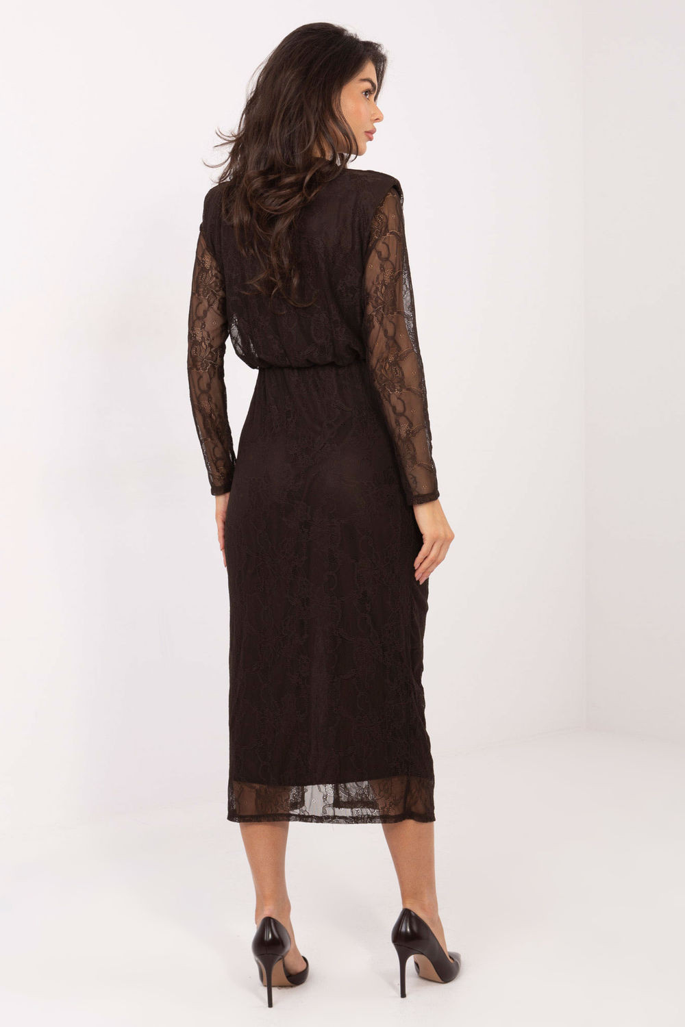 Elegantní krajkové šaty s klasickým ženským charakterem, ideální na formální události. Model ve formě tužkové sukně krásně zdůrazňuje postavu a gumový pás zaručuje pohodlí při nošení a perfektní přizpůsobení. Šaty jsou vyrobeny z kombinace viskózy a elastanu, co zaručuje měkkost, pružnost a pohodlí po celý den. Různorodá struktura materiálu a jemná krajka dodávají celku výjimečnou eleganci a jemný šarm. Midi délka ve spojení s dlouhým rukávem dělá model velmi stylový a nadčasový. Efektní volný výstřih dodává lehkost a ženský půvab, zatímco záhyby vpředu dole s rozparkem zdůrazňují postavu a zajišťují volnost pohybu. Šaty nemají zapínání, nasazují se přes hlavu. Model je vybaven podšitkou, s výjimkou rukávů, což zvyšuje pohodlí při nošení a estetiku dokončení. Jedná se o skvělou volbu na elegantní večírky, slavnostní události a oficiální schůzky.