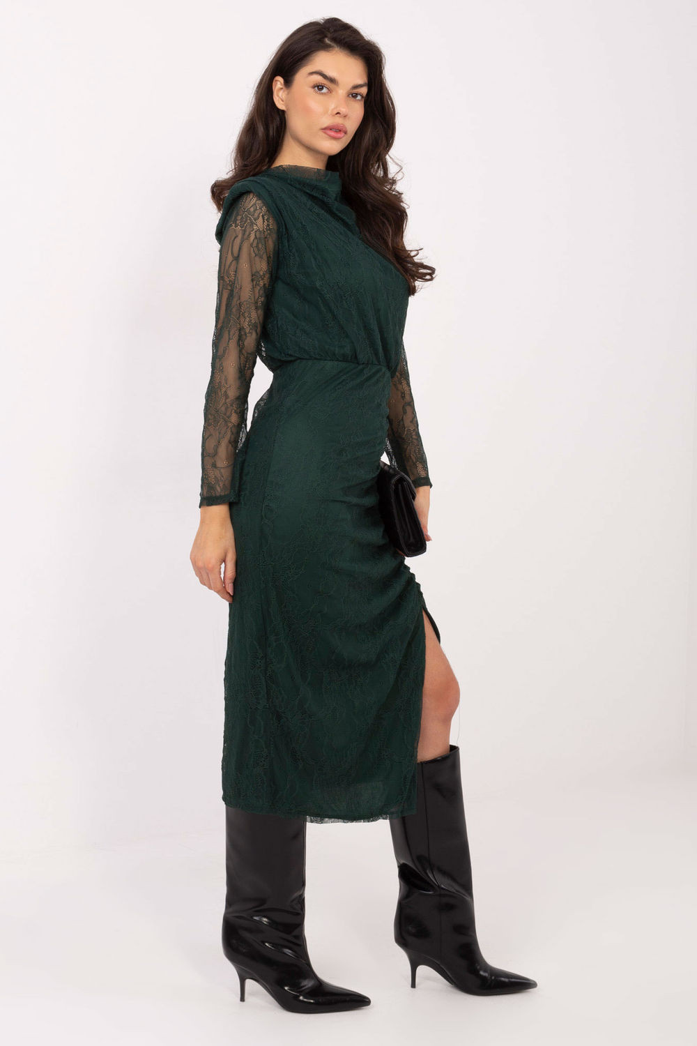 Elegánské krajkové šaty s klasickým a velmi ženským charakterem, ideální na slavnostní příležitosti. Pencilový střih krásně zdůrazňuje postavu, a elastický pas zajišťuje pohodlné nošení a skvělé přizpůsobení postavě. Model je vyroben z vysoce kvalitní viskózy s přídavkem elastanu, díky čemuž je materiál měkký, elastický a pohodlný na nošení. Různorodá struktura materiálu a krajkový detail dodávají šatům elegantní a luxusní vzhled. Střední délka ve spojení s dlouhým rukávem dává celku velmi stylový a nadčasový vzhled. Efektní volný výstřih přidává lehkosti a jemné smyslnosti, zatímco záhyby vpředu dole s rozparkem zdůrazňují postavu a zajišťují volnost pohybu. Šaty nemají zapínání a nasazují se přes hlavu. Model je vybaven polštářky na ramenou, které dodávají elegantní tvar a zdůrazňují linii ramen, a podšívku, s výjimkou rukávů, což zvyšuje pohodlí a estetiku zpracování. Je to skvělá volba na slavnostní události, oficiální setkání a výjimečné výlety.
