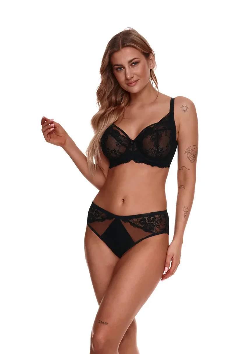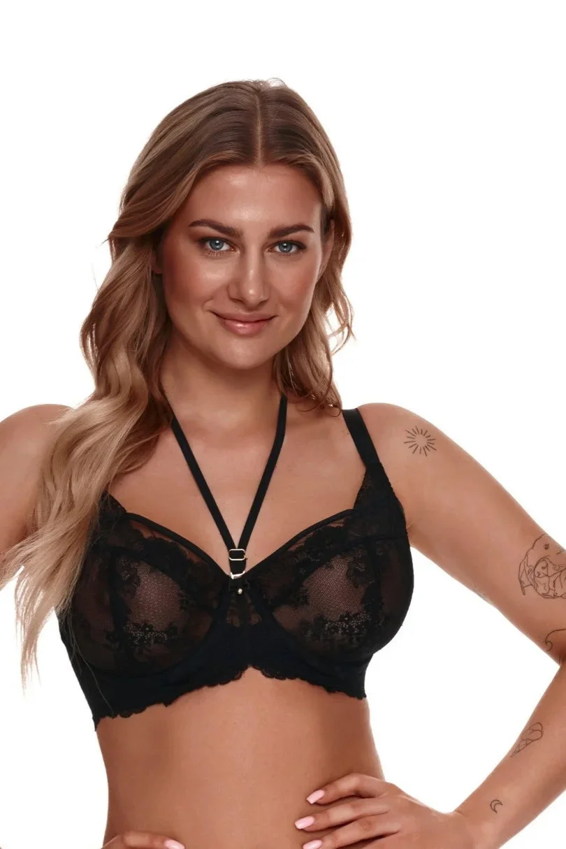 Biustonosz typu soft na fiszbinach, przeznaczony dla kobiet z większym biustem. Miski wykonane z plenu w kolorze czarnym z motywem roślinnym oraz koronki. Ramiączka regulowane, nieodpinane.Tył biustonosza gładki, wykonany z czarnej mikrofibry. Dodatkowym atutem jest odpinana ozdoba - hoker, która z jednej strony wykonana jest z koronki, a z drugiej strony jest jako dodatkowe ramiączko. Klasyka i elegancja w jednym. Szerokość ramiączek i typ zapięcia dopasowanEAN čárové kódy zboží jsou: