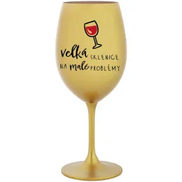 Vinná zlatá sklenice s originálním motivem VELKÁ SKLENICE NA MALÉ PROBLÉMY je krásným a osobitým dárkem, které ale využijete i Vy sami třeba ve chvílích, kdy si budete chtít zpříjemnit náročný den. Tyto originální vinné sklenice jsou totiž nejen pro výjimečné události, ale i pro běžné večery, které si chcete zpříjemnit sklenkou dobrého vína. Jistě proto potěší každého milovníka vína, i toho, kdo si umí svůj život vychutnat plnými doušky. Materiál sklo. Vyrobené s láskou v ČR