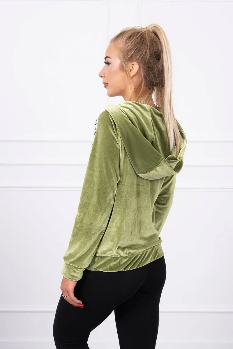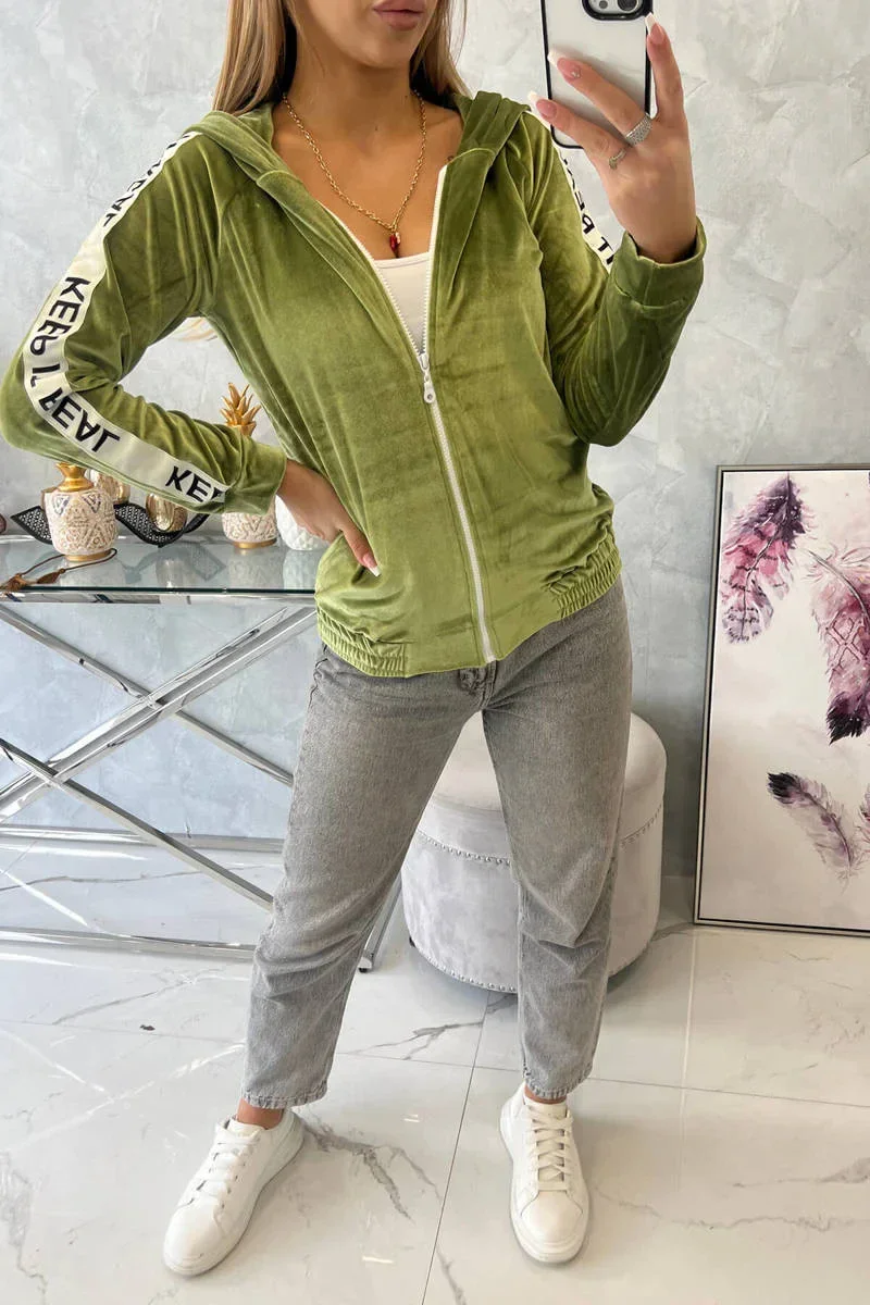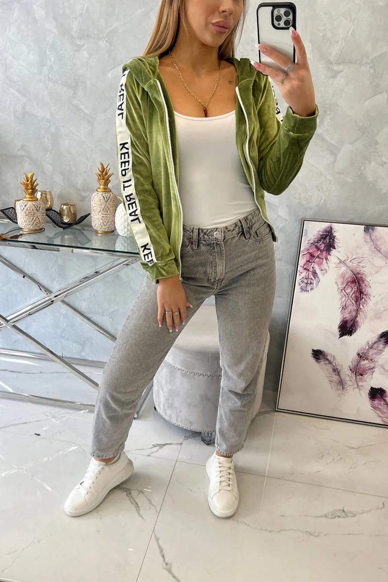 Představujeme vám módní mikinu s kapucí. Halenka z veluru. Mikina bez kapes se zapínáním na zip. Na ramenou jsou ozdobné stuhy s nápisem. Spodní část halenky zakončená gumou. Mikina je vyrobena z vysoce kvalitního materiálu. Velikost je univerzální a vyhovuje dámám, které nosí velikost S, M nebo L.
