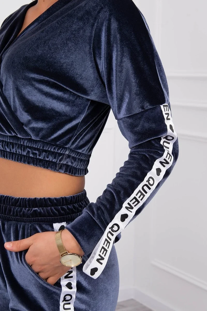 Představujeme vám sadu mikiny a kalhot. Sada z veluru. Mikina s výstřihem. Ozdobná stuha na ramenou s nápisem. Ve spodní části mikiny je všitá guma. Kalhoty s kapsami a páskou na nohavicích. Velmi módní a stylová sada. Sada je vyrobena z vysoce kvalitního materiálu. Velikost je univerzální a vyhovuje dámám velikosti S, M nebo L.
