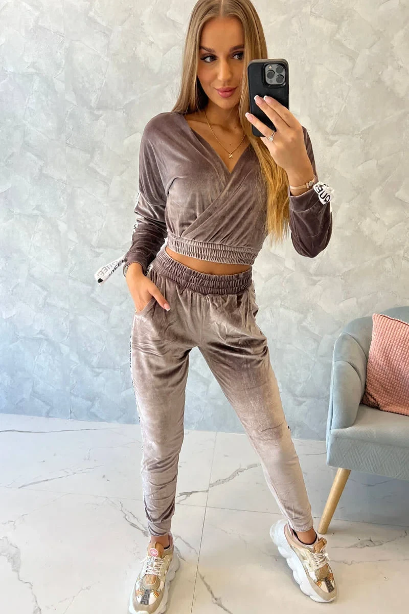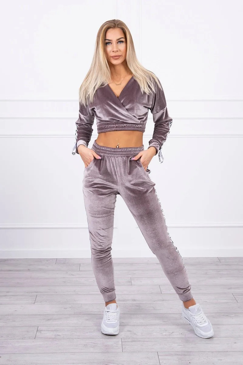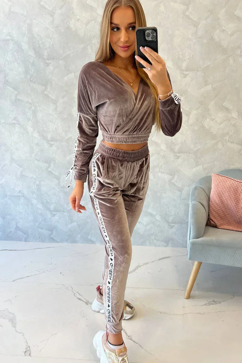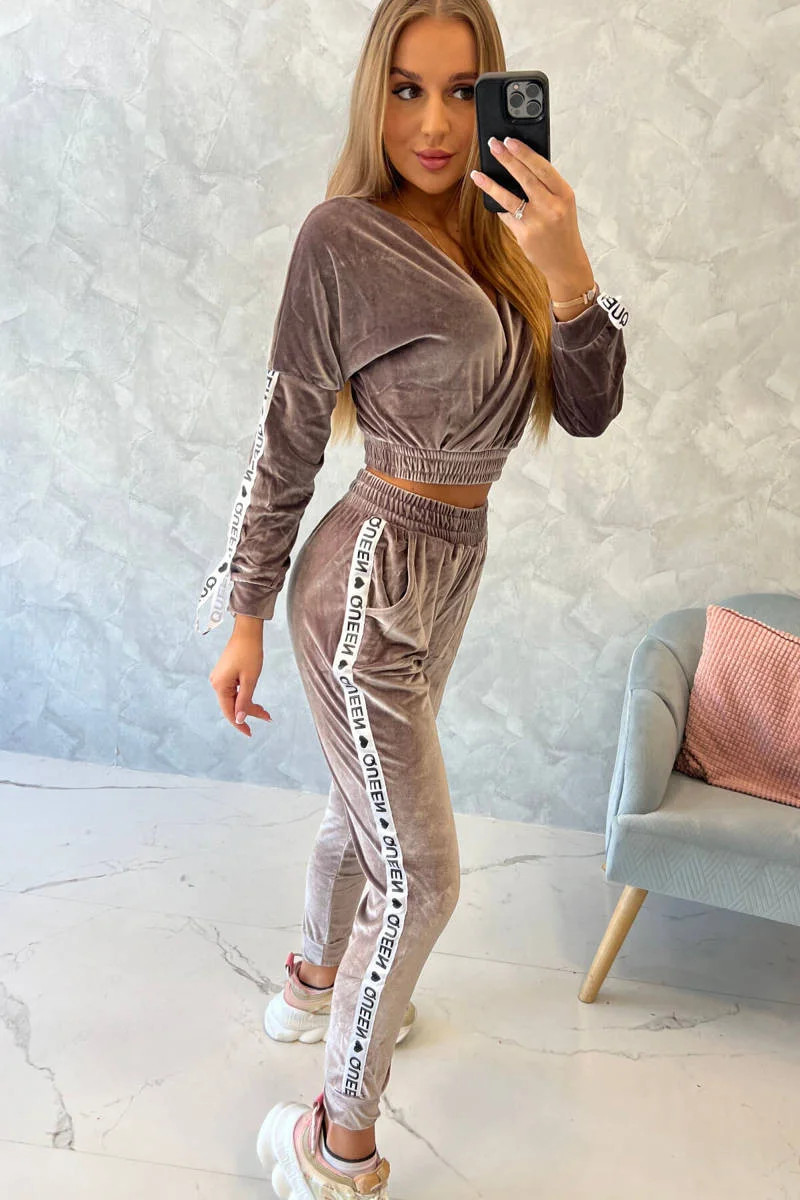 Představujeme vám sadu mikiny a kalhot. Sada z veluru. Mikina s výstřihem. Ozdobná stuha na ramenou s nápisem. Ve spodní části mikiny je všitá guma. Kalhoty s kapsami a páskou na nohavicích. Velmi módní a stylová sada. Sada je vyrobena z vysoce kvalitního materiálu. Velikost je univerzální a vyhovuje dámám velikosti S, M nebo L.