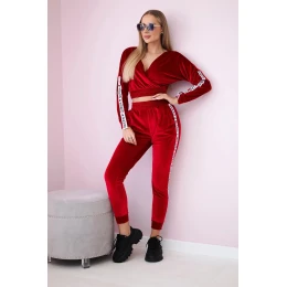 Představujeme vám sadu mikiny a kalhot. Sada z veluru. Mikina s výstřihem. Ozdobná stuha na ramenou s nápisem. Ve spodní části mikiny je všitá guma. Kalhoty s kapsami a páskou na nohavicích. Velmi módní a stylová sada. Sada je vyrobena z vysoce kvalitního materiálu. Velikost je univerzální a vyhovuje dámám velikosti S, M nebo L.