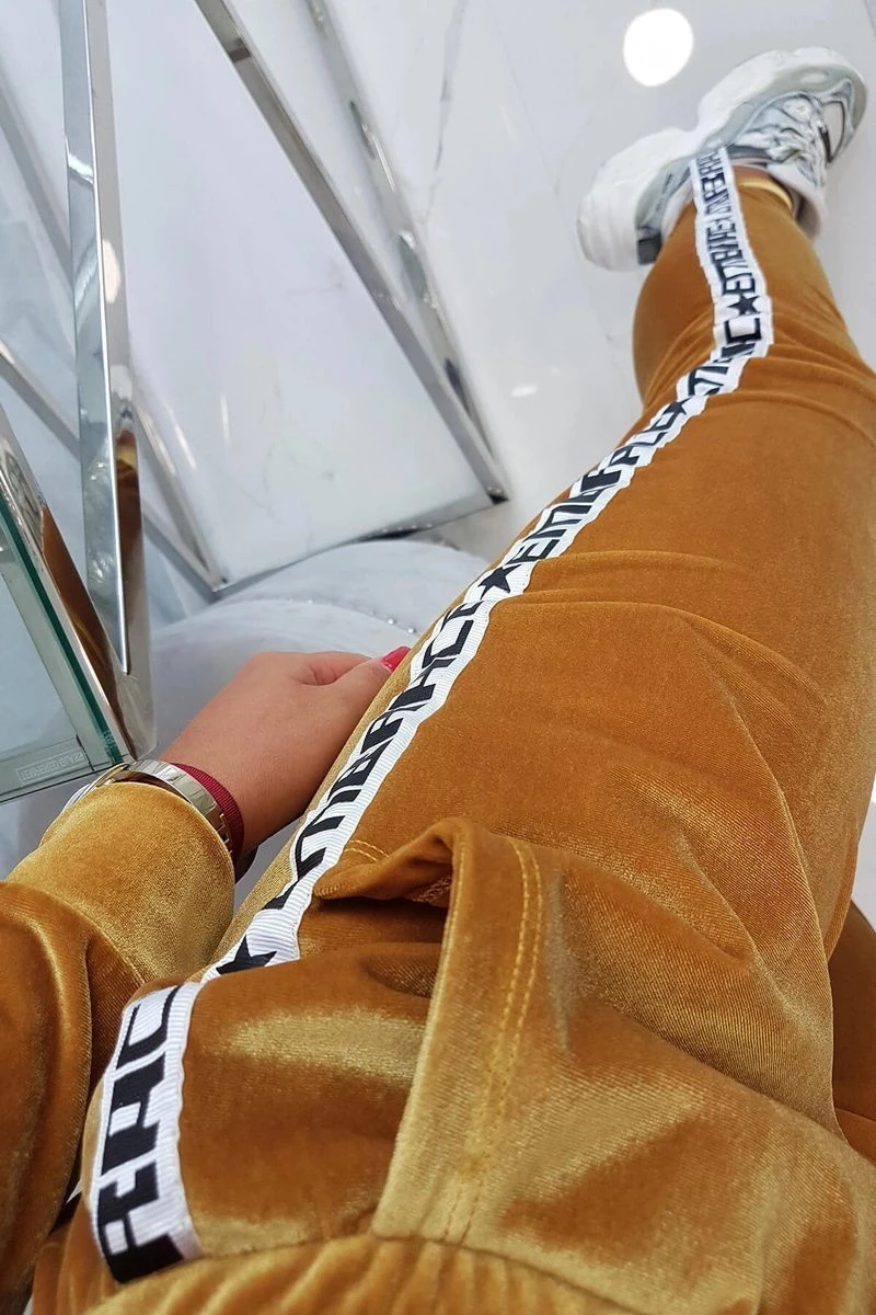 Představujeme vám sadu mikiny a kalhot. Sada z veluru. Mikina má kapuci a zapínání na zip. Ozdobná stuha na ramenou s nápisem. Ve spodní části mikiny je všitá guma. Kalhoty s kapsami a páskou na nohavicích. Velmi módní a stylová sada. Sada je vyrobena z vysoce kvalitního materiálu. Velikost je univerzální a vyhovuje dámám velikosti S, M nebo L.