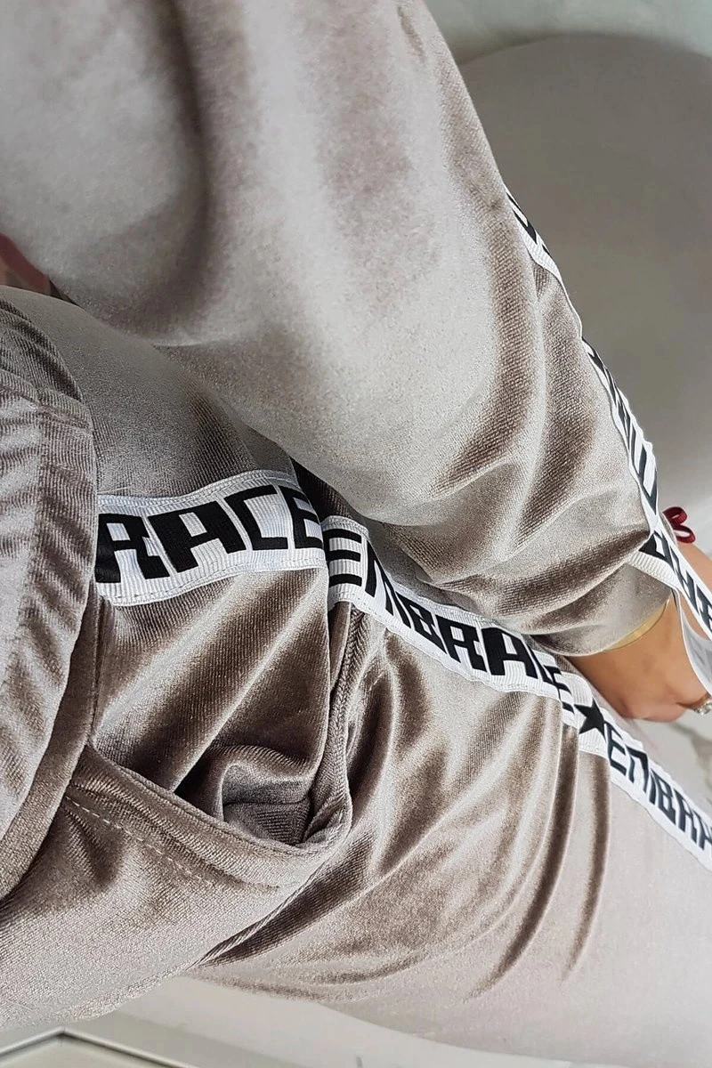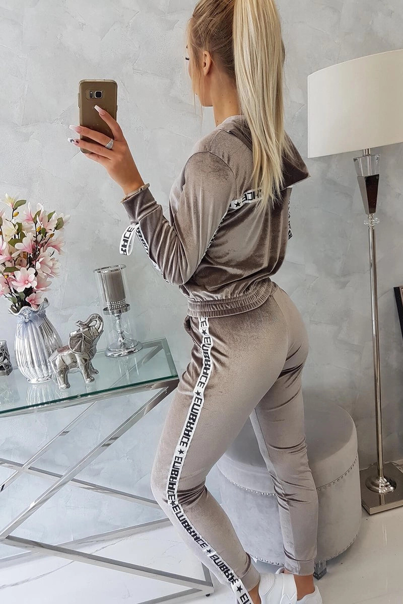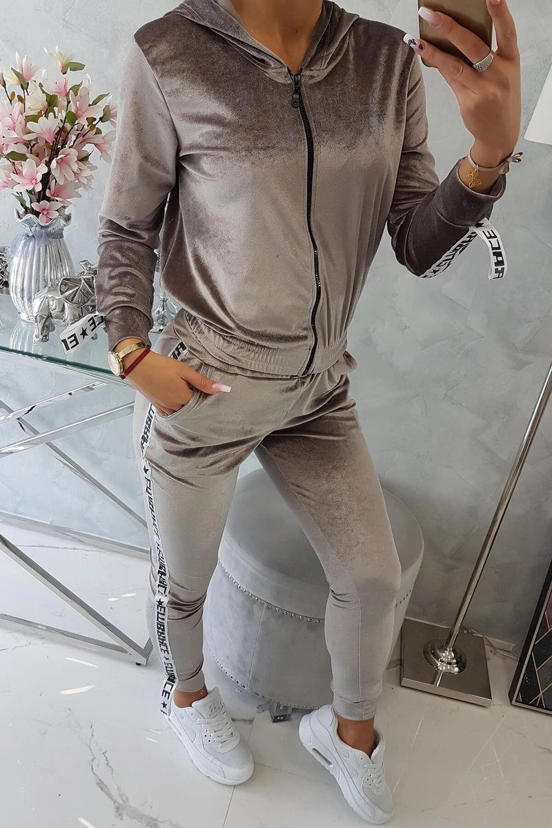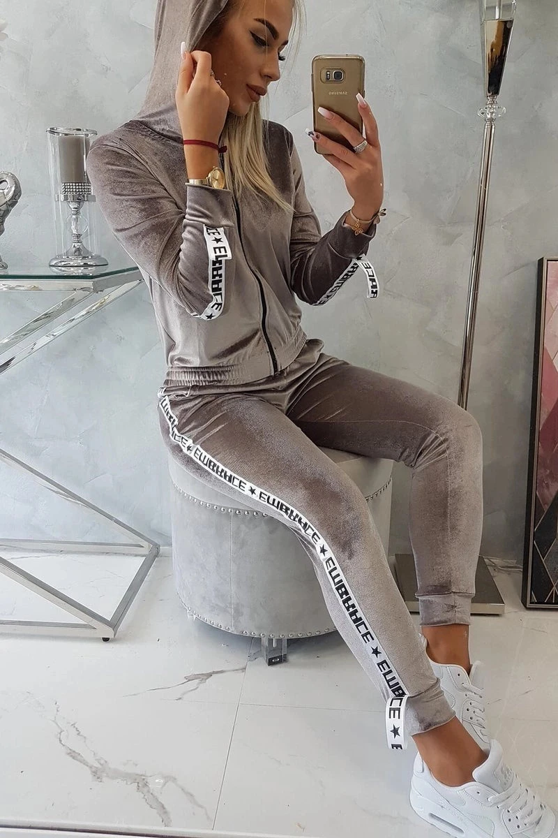 Představujeme vám sadu mikiny a kalhot. Sada z veluru. Mikina má kapuci a zapínání na zip. Ozdobná stuha na ramenou s nápisem. Ve spodní části mikiny je všitá guma. Kalhoty s kapsami a páskou na nohavicích. Velmi módní a stylová sada. Sada je vyrobena z vysoce kvalitního materiálu. Velikost je univerzální a vyhovuje dámám velikosti S, M nebo L.