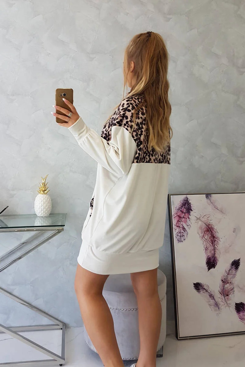 Prezentujemy Państwu welurową sukienkę z motywem panterki. Sukienka posiada suwak na dekolcie oraz kieszeń z przodu. Sukienka wykonana jest z wysokiej jakości materiału. Rozmiar jest uniwersalny i będzie odpowiedni dla Pań noszących rozmiar S, M lub L.