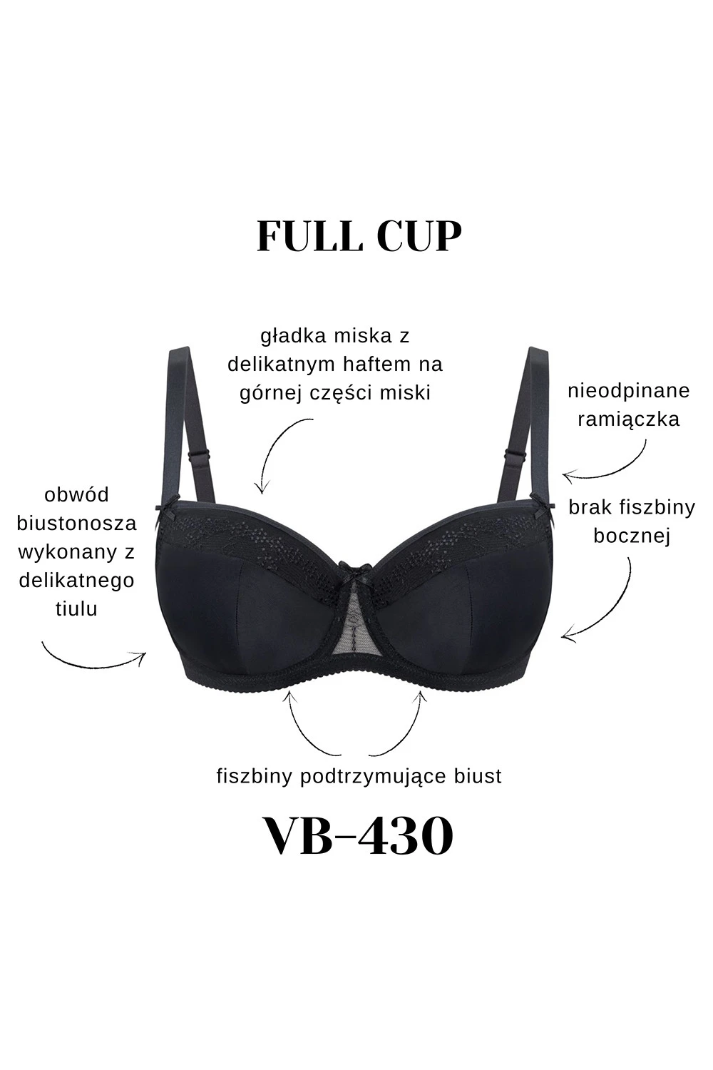 Podprsenka od Veny. Model VB-430. Má dráty, které prsa vhodně tvarují. Kovové háčky na popruh. Podprsenka se zapínáním na háčky a oči. Upevňovací bod: vzadu. Dvě řady svislých háčků. Čtyři stupně horizontálních háčků. Výrobek je vyroben ze 75 % z polyamidu, 15 % z elastanu, 5 % z polyesteru a 5 % z bavlny. Výrobek pro ženy.