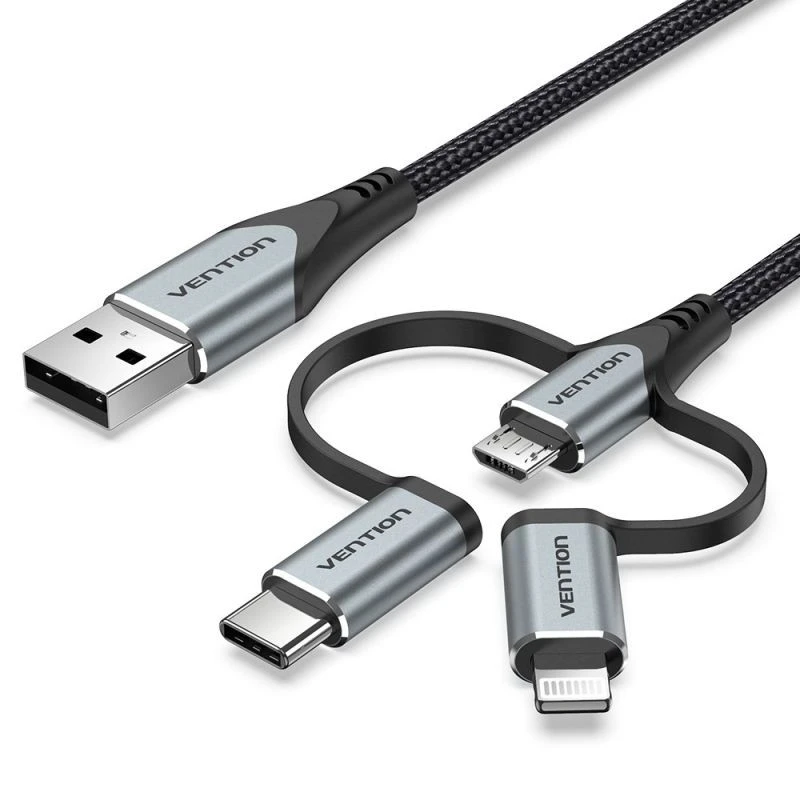 Vention USB-A 3v1 Micro-B USB-C Lightning kabel 1m šedý