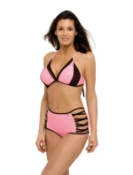 Podprsenka se pohodlně zavazuje za krkem a na zádech a má vyztužené košíčky s push-up vložkou, takže prsa jsou dokonale shrnutá, pozvednutá a zvětšená (push-up vložka je součástí každé velikosti plavek a z modelu se nevyjímá). Dekolt je z hladkého černého tylu a košíčky mají vsadku z látky imitující smyslnou krajku. Kalhotky jsou opravdovým hitem - jsou vyšší, a proto velmi pohodlné, navíc maskují bříško a díky bočním ramínkům vypadají stále žensky a svůdně. Italská látka, krásné barvy na výběr, stojí za to.