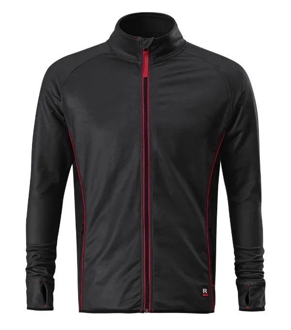 hladký strečový rychleschnoucí materiál rovný střih s bočními švy celopropínací reverzní spirálový zip s krytkou brady vnitřní průkrčník začištěn páskou raglánové rukávy manžety s otvorem pro palec kapsy na zip lemování elastickým proužkem kontrastní prvky poutko na zavěšení