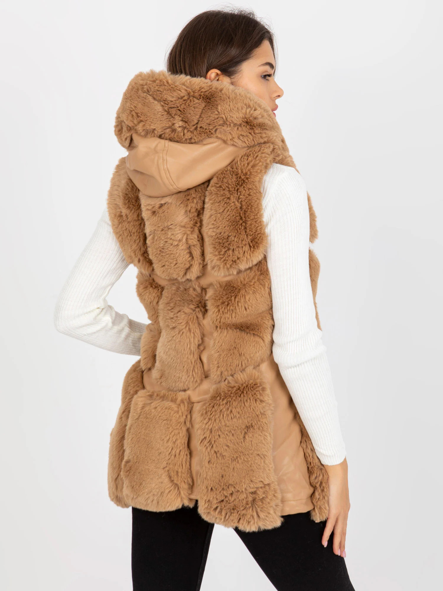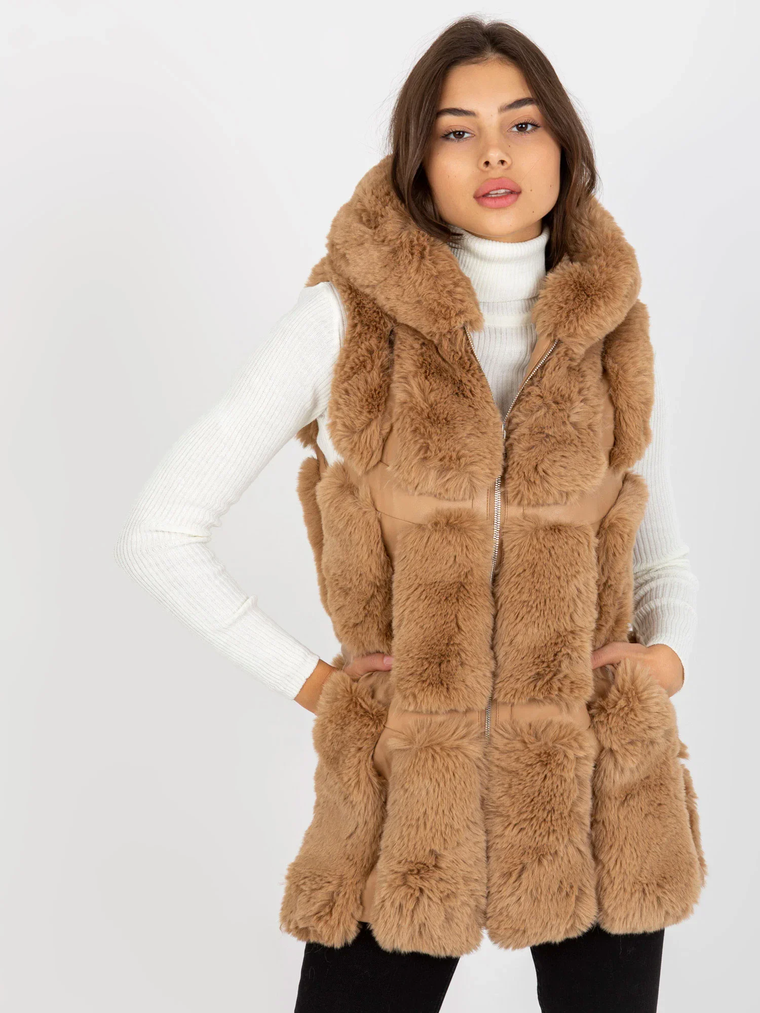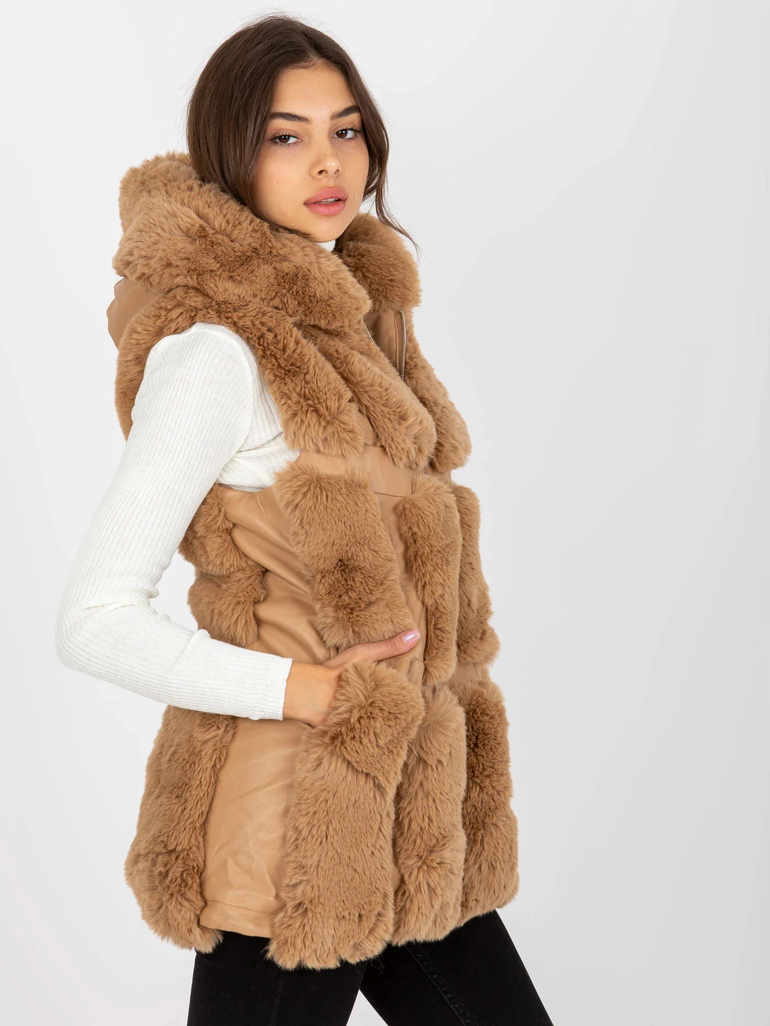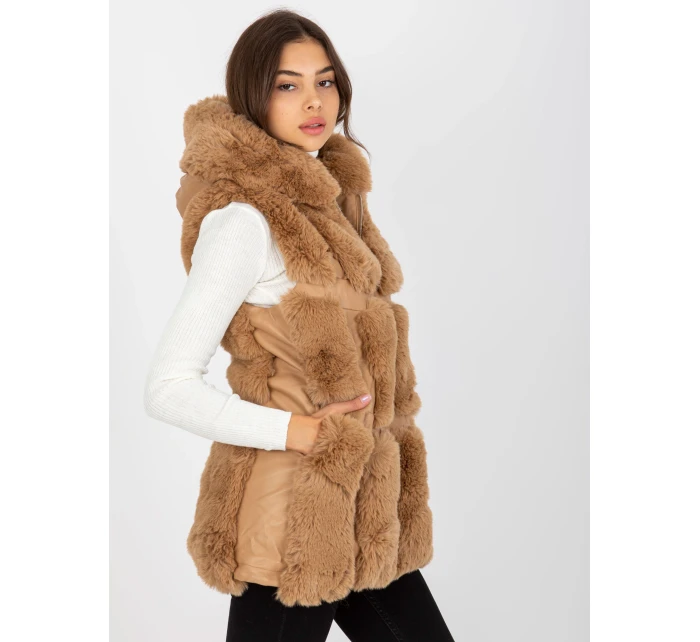 Velbloudí a béžová dámská vesta z ekokůže s kožešinou .